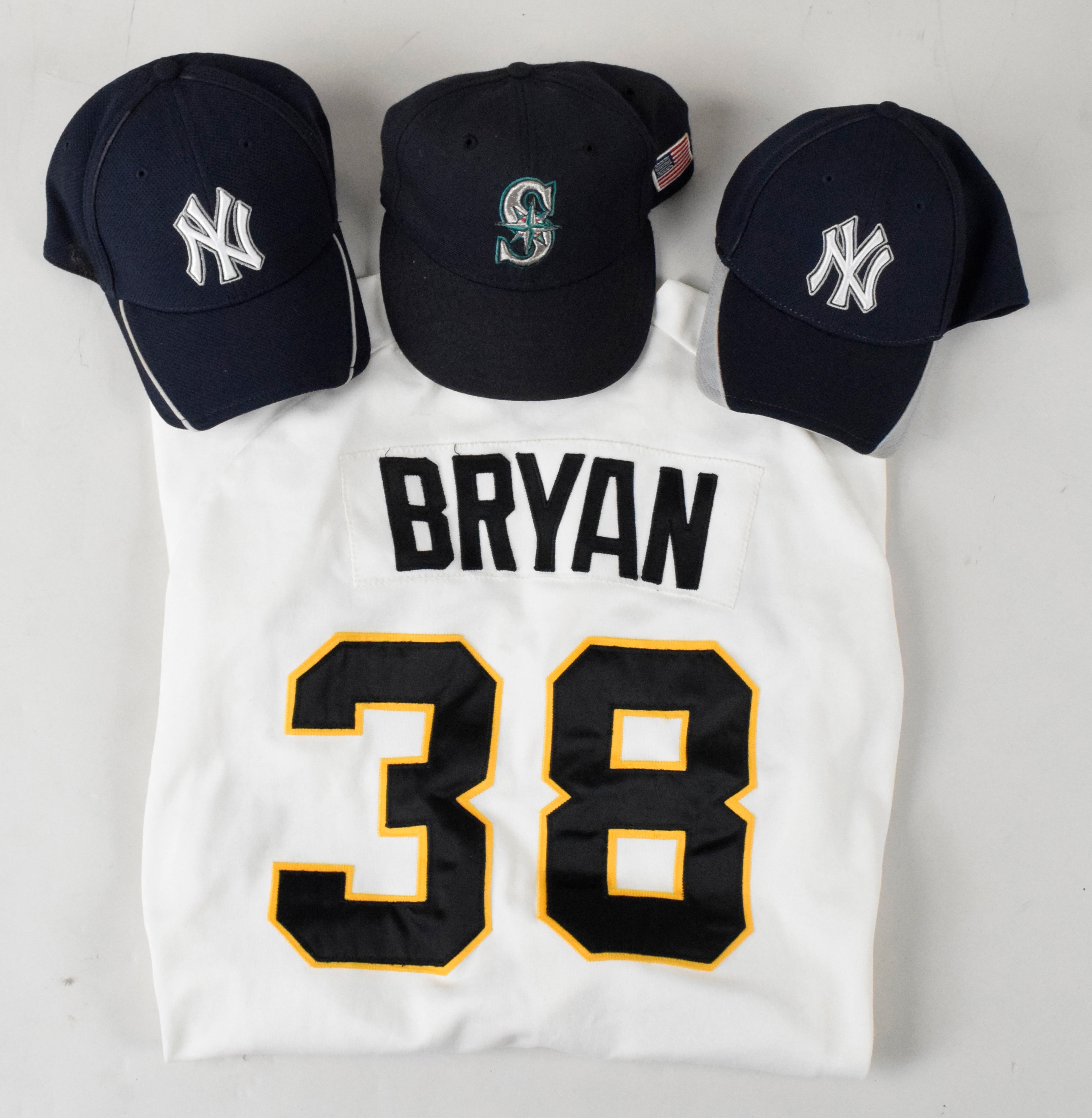 Description:Lot of college and professional model baseball jerseys and hats (EX). Includes c.late 1980s - early 1990s Athletic Sewing size XL New York Yankees #36 batting practice / spring training jersey attributed to minor league pitching coach Dave Jorn with "JORN" written on the tag, c.1994-95 Wilson size 46 Wichita State Shockers #38 BRYAN jersey, c.late 2001 New Era MLB Authentic Collection size 7 Seattle Mariners hat with American flag patch on the left side and #10 written under the brim, 2010 New Era MLB Authentic Collection size M-L Yankees spring training hat attributed to Chan Ho Park with his #61 written inside, and 2010 New Era MLB Authentic Collection size L-XL Yankees spring training hat attributed to Damaso Marte with his #43 written under the brim: EX