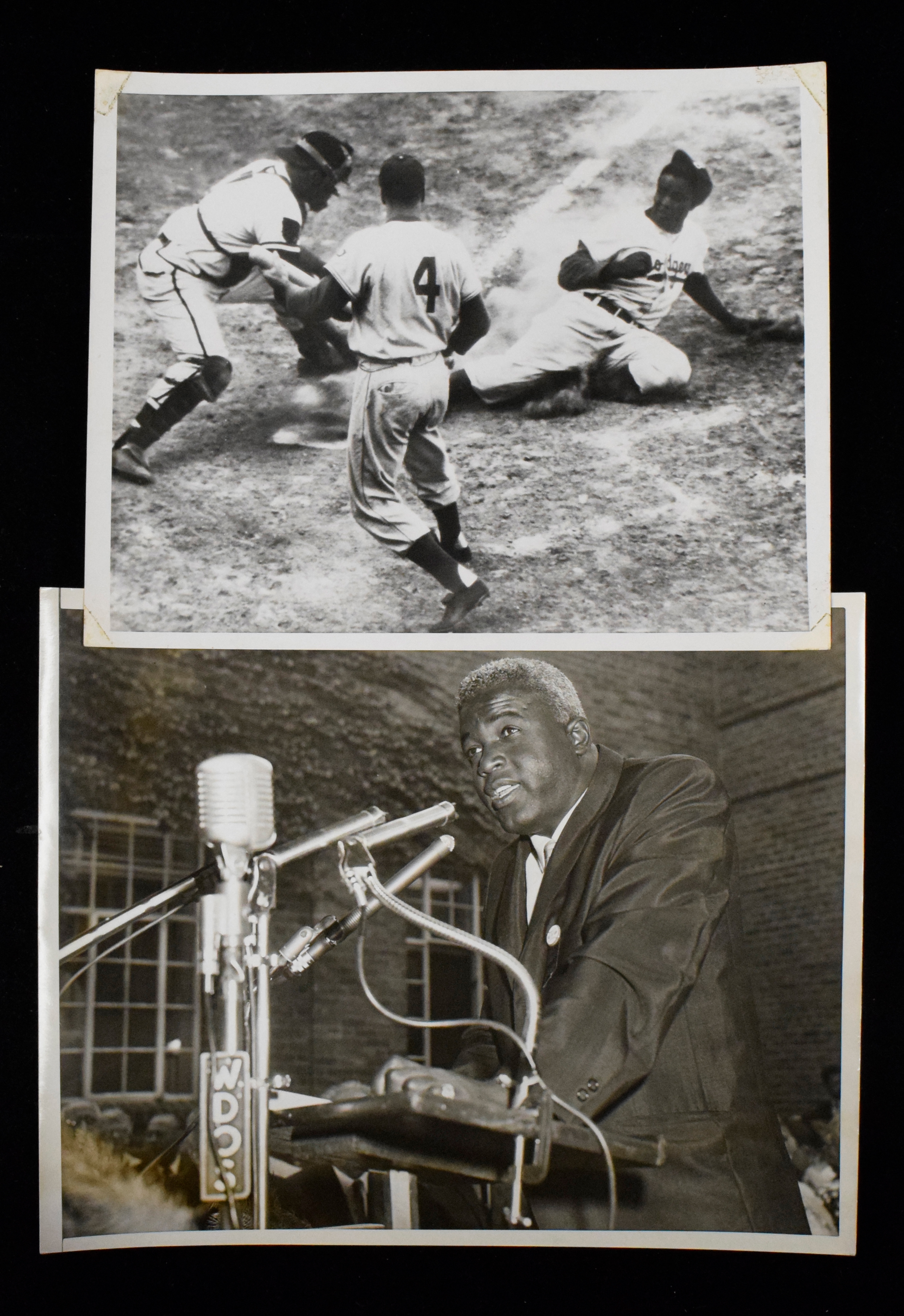 Description:Lot of (2) vintage Jackie Robinson photographs, c.1951-1962 (VG/EX-EX). Includes 7.25"x9" c.1951 photo picturing Robinson sliding at home plate (VG/EX tape stains at corners), and 8"x10" c.1962 photo picturing Robinson giving his HOF induction speech (EX).