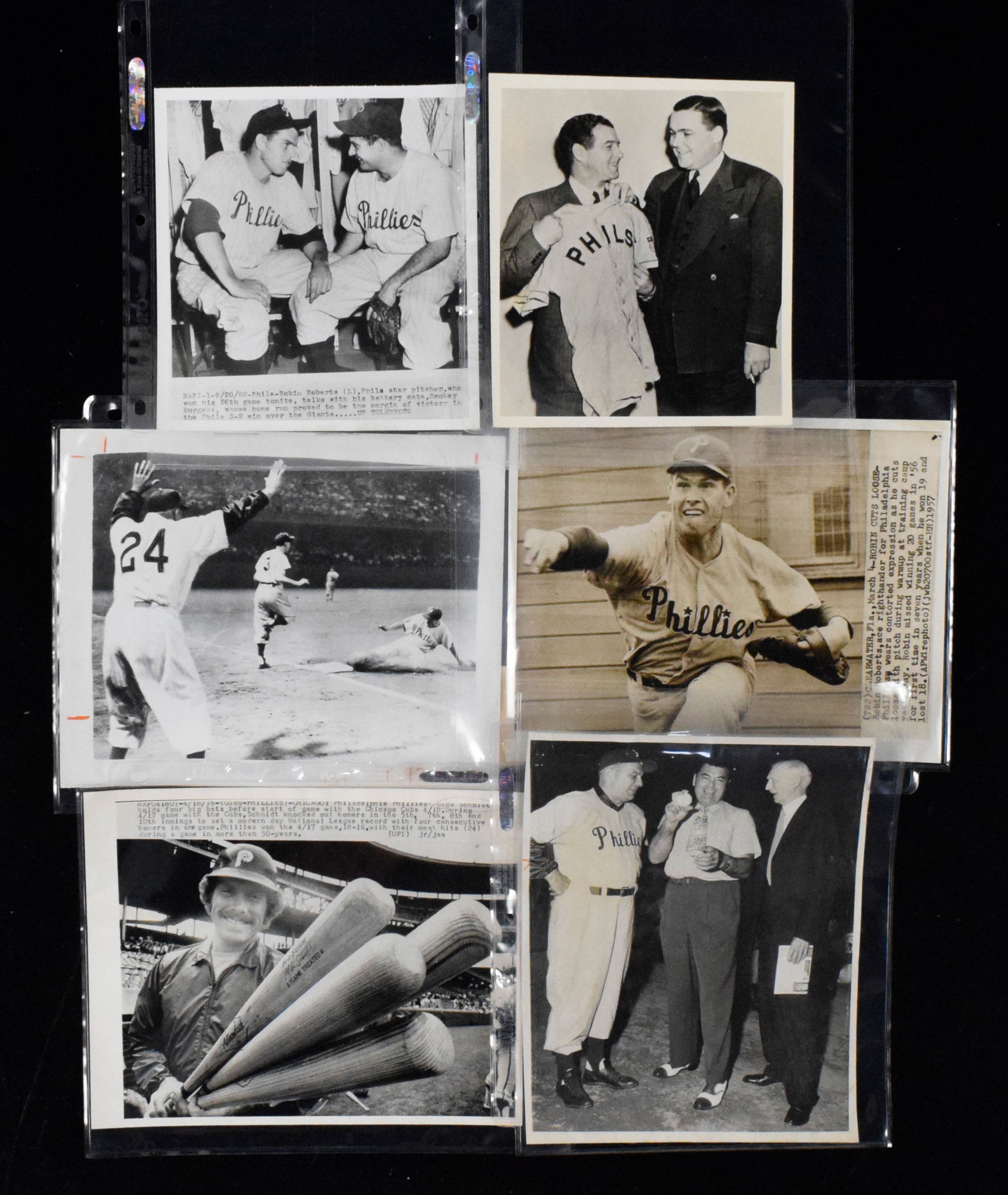 Description:Lot of (20) vintage Philadelphia Phillies photos including Ashburn, Roberts, Schmidt, c.1920s-1976 (GD-EX/MT). Images include Eddie Sawyer with Connie Mack and Jack Dempsey, (6) Robin Roberts, Richie Ashburn, Mike Schmidt, Bucky Harris, Dolph Camilli, Art Fletcher, Walter Holke, Fritz Knothe, Willie Jones, Alex Johnson, Bobby Morgan, and others. Most appear to average VG/EX-EX overall. Range: GD-EX/MT