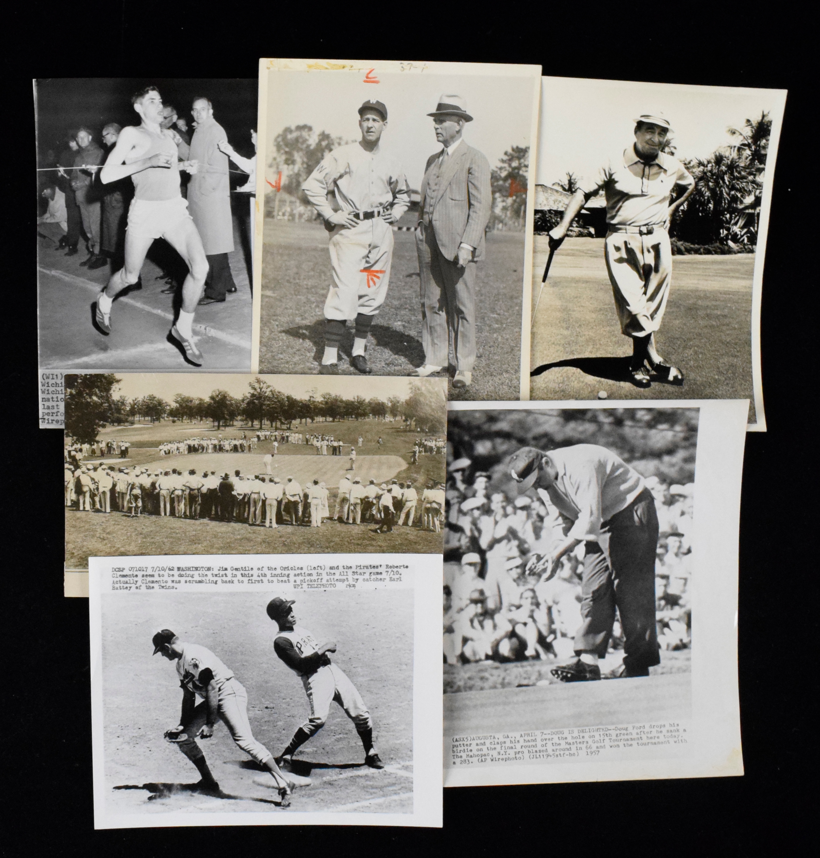 Description:Mixed sports lot of (39) vintage photographs, c.1930s-70s (GD-EX/MT). Includes (13) baseball: Clark Griffith with Bucky Harris, Roberto Clemente, Ken Boyer, Jimmy Piersall, Bubba Phillips, and others. Remainder are a mix of sports including golf (Walter Hagen and Gene Sarazen), wrestling (Gus Sonnenberg), track & field (Jim Ryun), ladies basketball, horse racing, and others. Most appear to average VG/EX-EX overall. Range: GD-EX/MT