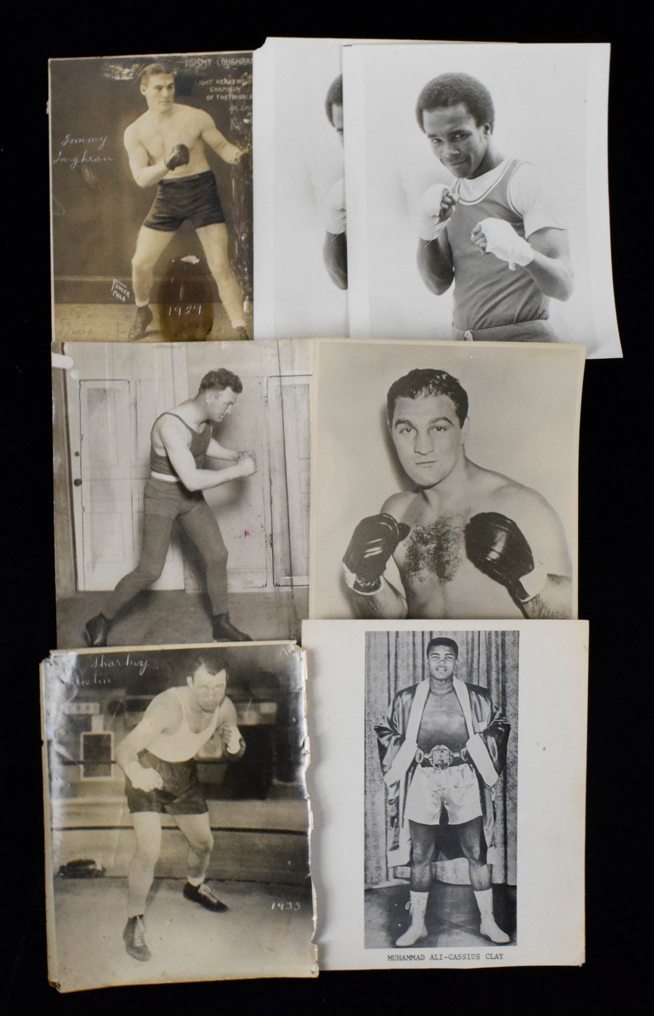 Description:Nice lot of (83) boxing photographs including HOFers, c.1920s-80s (PR-NM). Includes Rocky Marciano, Tommy Loughran, Gene Tunney, Tommy Gibbons, Sugar Ray Leonard, Jack Sharkey, Jess Willard, Cassius Clay / Muhammad Ali, Floyd Patterson, Jerry Quarry, Joe Louis, Carmen Basilio, Prino Carnera, Max Baer, Rocky Graziano, Joe Frazier, Alexis Arguello, and many others. Various conditions throughout the lot. Most appear to average VG-VG/EX overall with normal age and handling wear. Range: PR-NM
