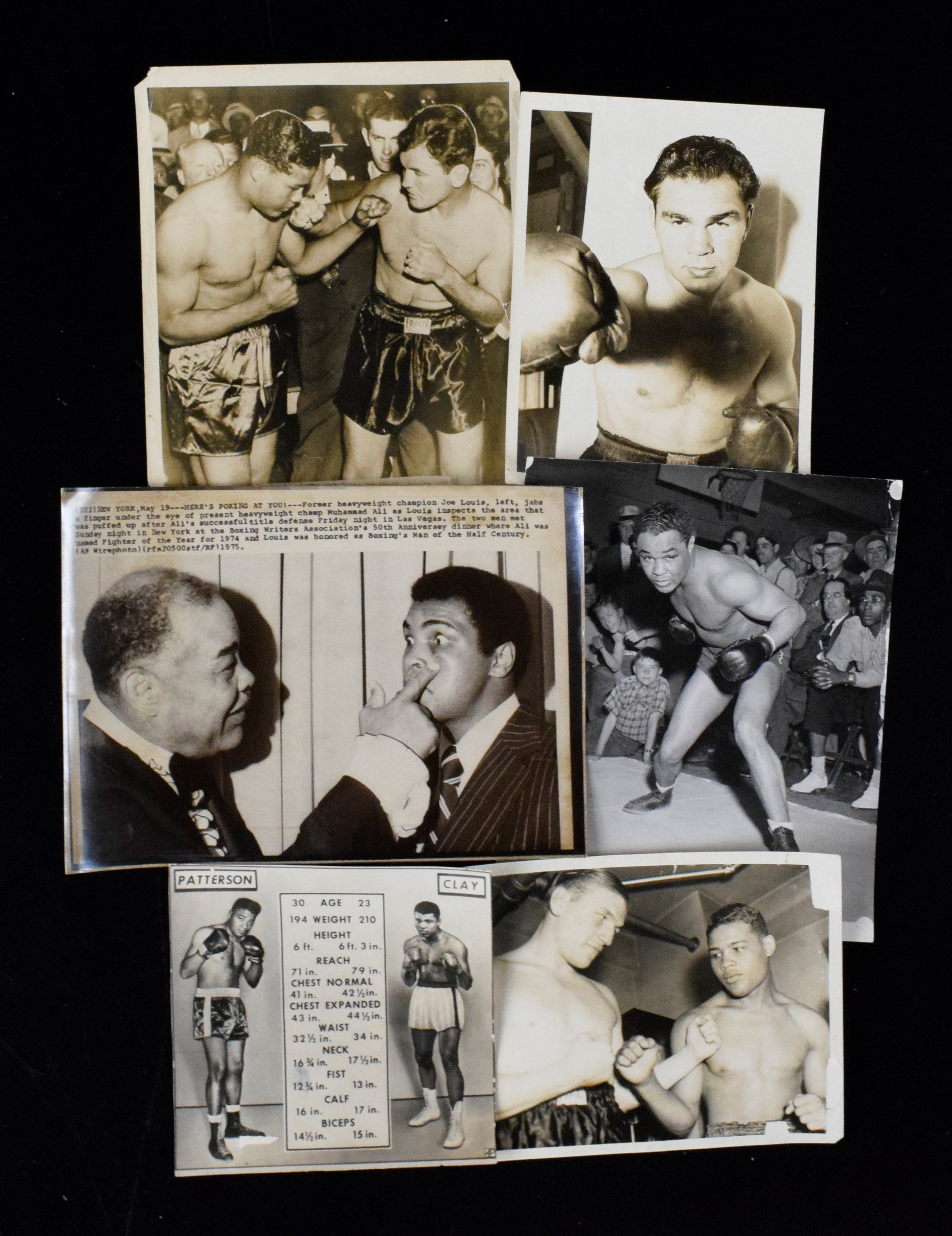 Description:Lot of (50) boxing photographs including HOFers, c.1930s-70s (PR-NM). Includes Rocky Marciano, Floyd Patterson, Cassius Clay / Muhammad Ali, Joe Louis, Ezzard Charles, Archie Moore, Kid Gavilan, John Henry Louis, Jimmy Braddock, Jersey Joe Walcott, Sonny Liston, Max Schmeling, Henry Armstrong, and many others. Various conditions throughout the lot. Most appear to average VG-VG/EX overall with normal age and handling wear. Range: PR-NM