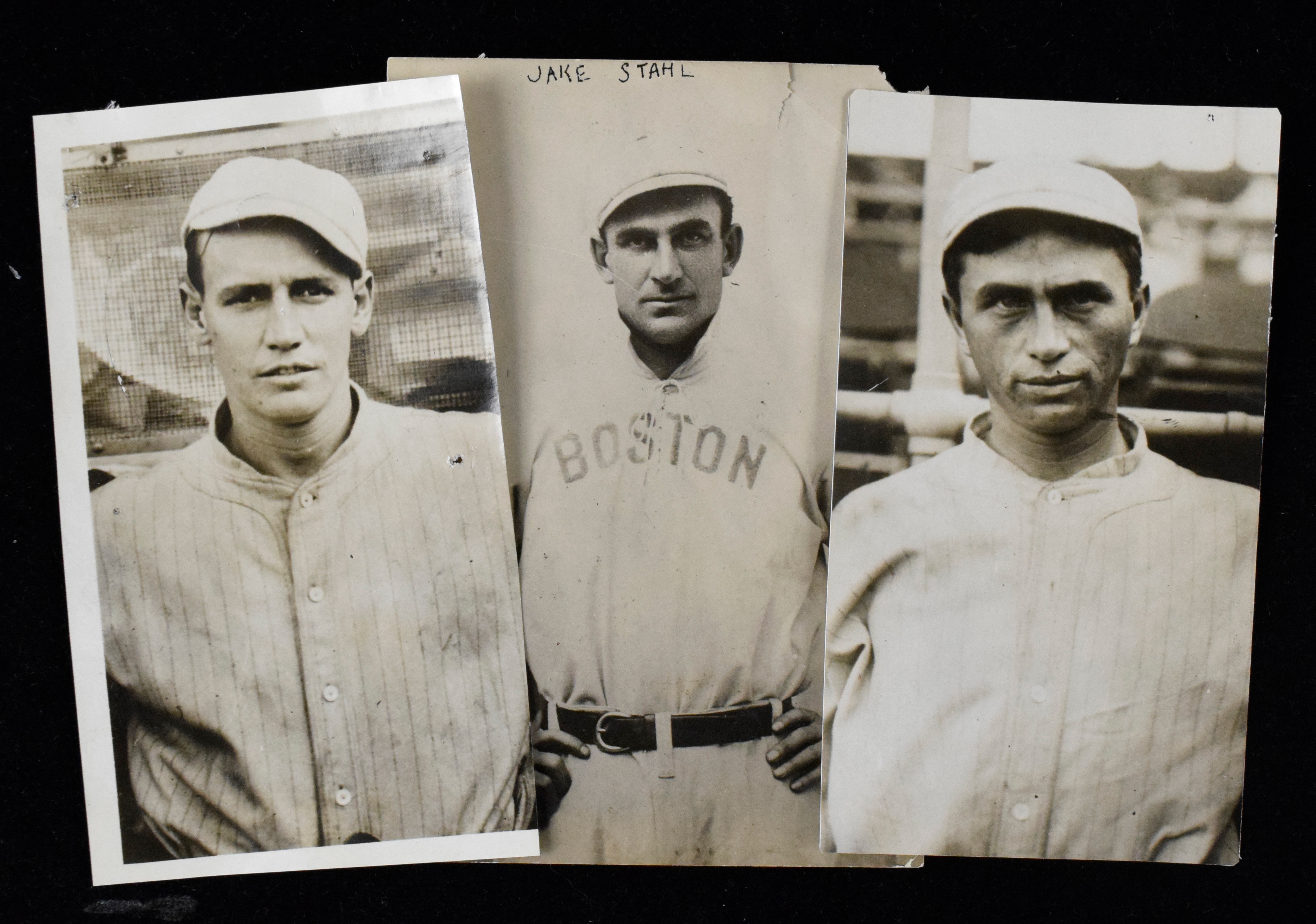 Description:Harry Hooper, Joe Wood, and Jake Stahl photographs, c.1911-1922 (GD-VG/EX). Includes 4"x6" c.1911 Jake Stahl photo by George Grantham Bain (GD-G/VG), 3.25"x5.75" c.1919 Joe Wood photo (G/VG), and 3.25"x5.75" c.1922 Harry Hooper photo by Underwood (VG-VG/EX).