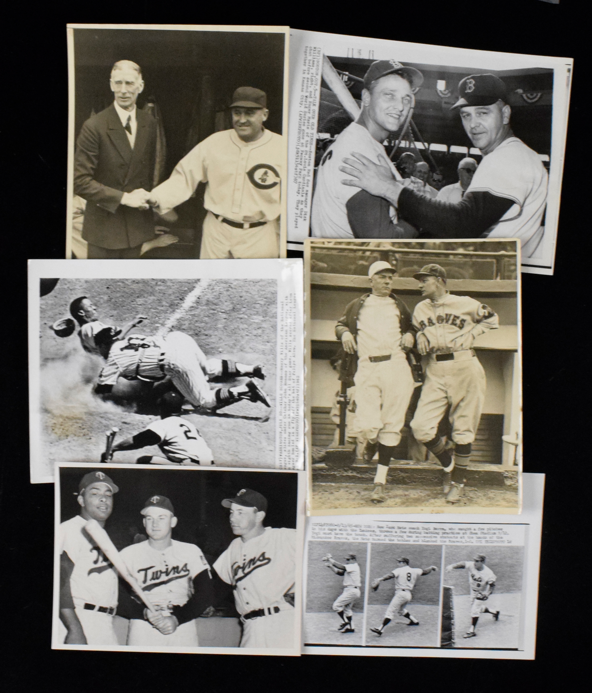 Description:lot of (40) vintage baseball photographs, c.1930s-70s (FR/GD-EX/MT). Includes Connie Mack, Joe McCarthy, Mel Ott, Tony Oliva, Yogi Berra, Harmon Killebrew, Dick Williams, Roger Maris, Maury Wills, Chico Fernandez, Earl Battey, Rich Rollins, Felix Mantilla, Ron Hunt, Jim Pyburn, and others. Most appear to average VG/EX overall. Range: FR/GD-EX/MT