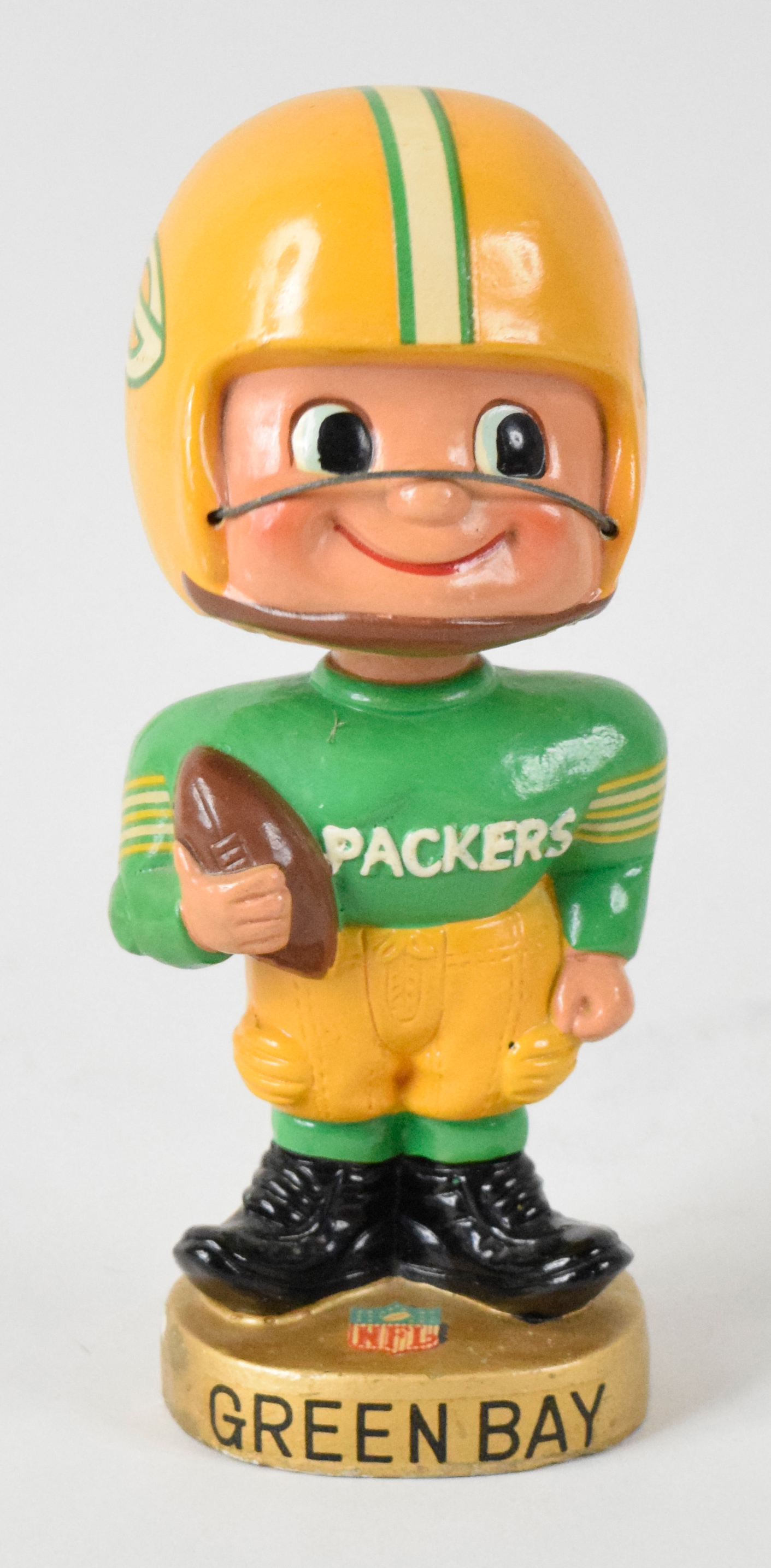 Description:Green Bay Packers vintage toes-up nodder, c.1961-66 (EX-EX/MT). Type 2 variation with round gold base, football held vertically, large Green Bay decal across the base, and PACKERS embossed on the chest. Paint chips on the base, and very minor helmet chip: EX-EX/MT