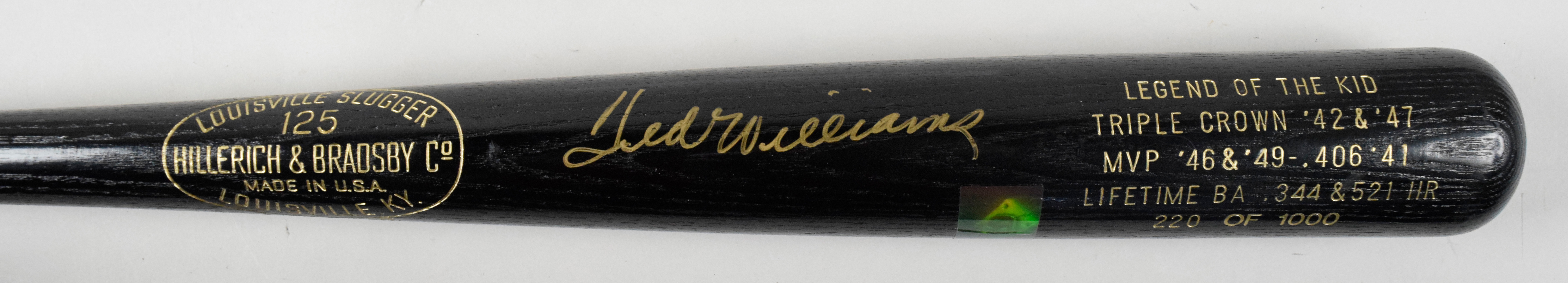 Description:Ted Williams autographed "Legend Of The Kid" limited edition baseball bat - Green Diamond (NM). 35" Louisville Slugger commemorative bat stamped with various Ted Williams accomplishments. Williams signed the bat in gold marker. Signature rates 9 out of 10. Green Diamond hologram sticker is on the bat, and the bat is #ed 220/1000: NM ($400-$600)