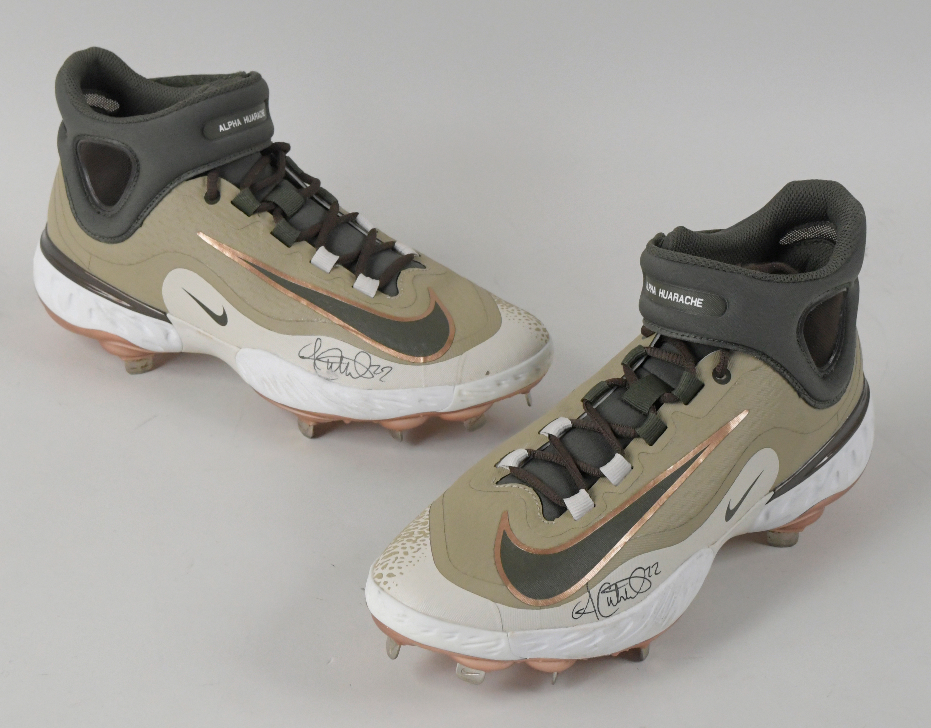 Description:Andrew McCutchen autographed 2024 Armed Forces Weekend game worn cleats - 305th career HR (EX). Nike size 10.5 spikes with camouflage color scheme, and #22 decal on each tongue tag. McCutchen wore the cleats during the first game of MLB's Armed Forces Weekend on May 17th against the Cubs, and hit his 305th career home run in the game. McCutchen signed both cleats in black marker. Signatures rate 7 and 9 out of 10. Hunt Auctions serial #ed hologram sticker is on each shoe. Wear visible mainly on the heels and shoe bottoms: EX ($750-$1,500)