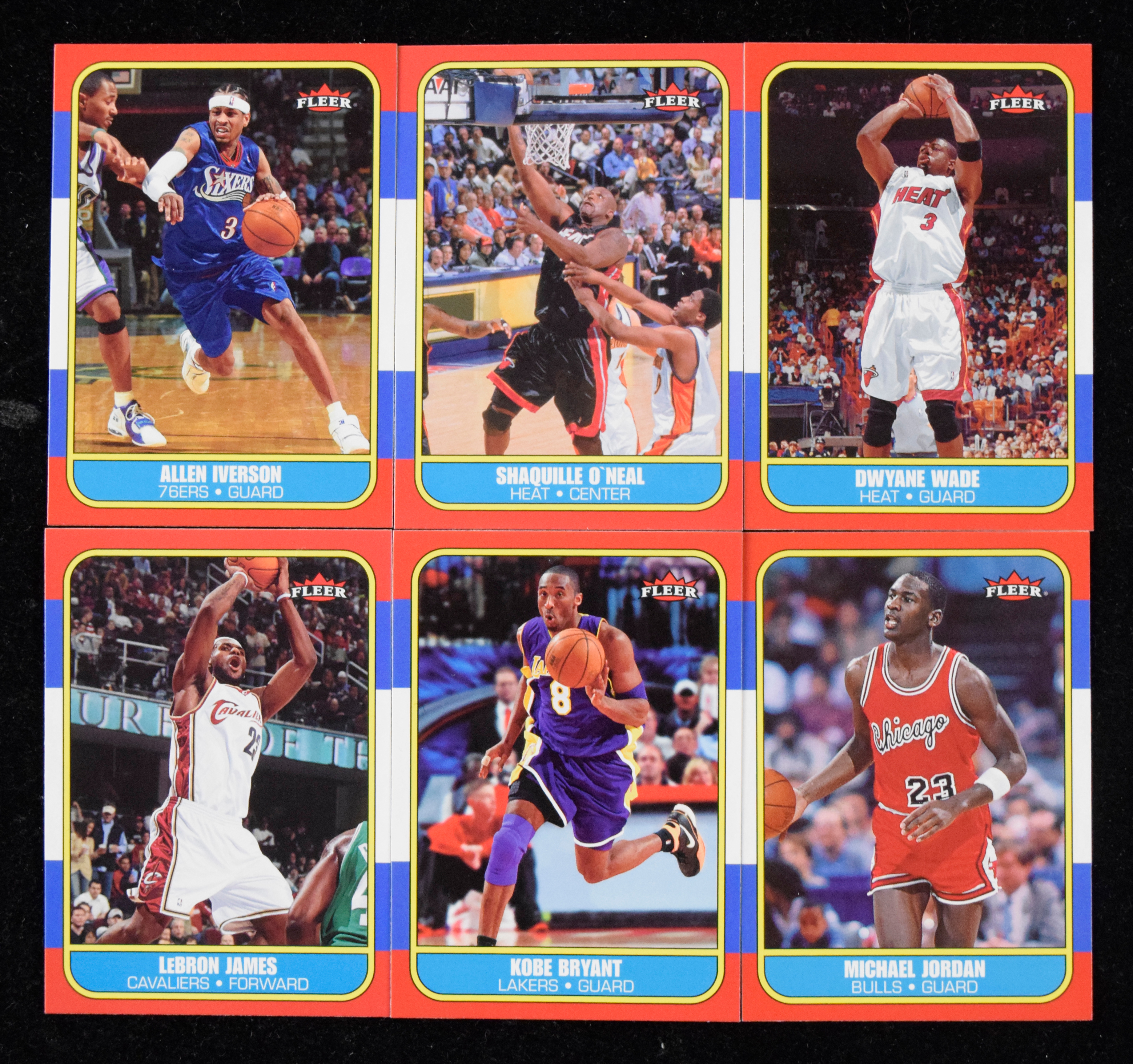 Description:2006-07 Fleer basketball 20th Anniversary complete set (132) with Jordan, LeBron (MT overall). Very nice retro set celebrates the 20th anniversary of Fleer's landmark 1986 Fleer set, which included the iconic rookie card of Michael Jordan and others. Complete 2006-07 anniversary set of (132) different cards features superstars of past and present, including Michael Jordan, Kobe Bryant, LeBron James, Dwyane Wade, Carmelo Anthony, Shaquille O'Neal, Allen Iverson, Dwayne Wade and more. Cards, housed in clean top loaders, appear MT or better overall, with likely a few slightly less. ($500-$1,000)