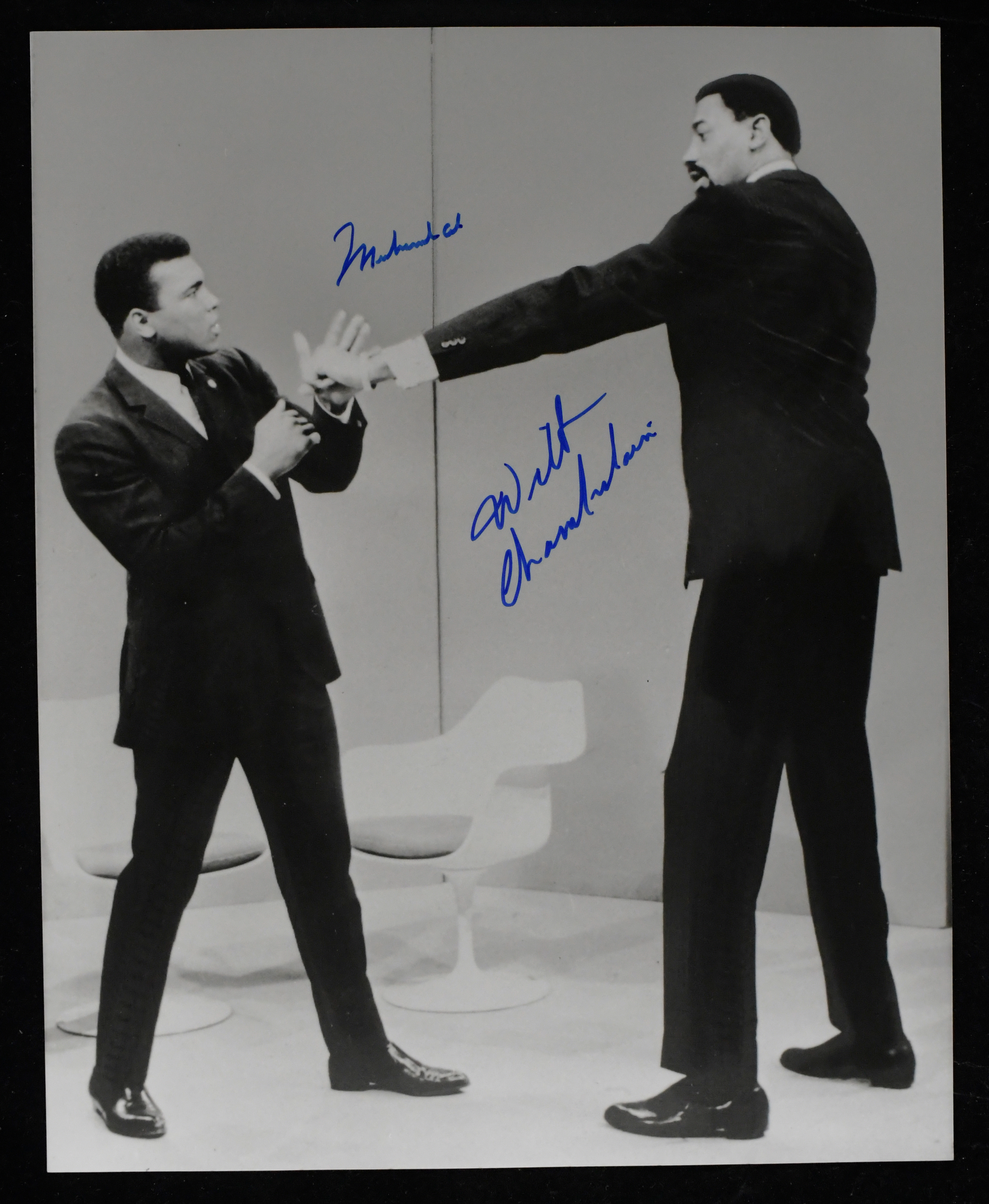 Description:Wilt Chamberlain & Muhammad Ali dual-signed 16"x20" photograph (PSA 10 Overall Grade). Chamberlain and Ali both signed the photo in blue marker. Includes full LOA from PSA/DNA grading both autographs 10, for an overall grade of 10. Minimal wear: NM/MT ($1,500-$2,500)