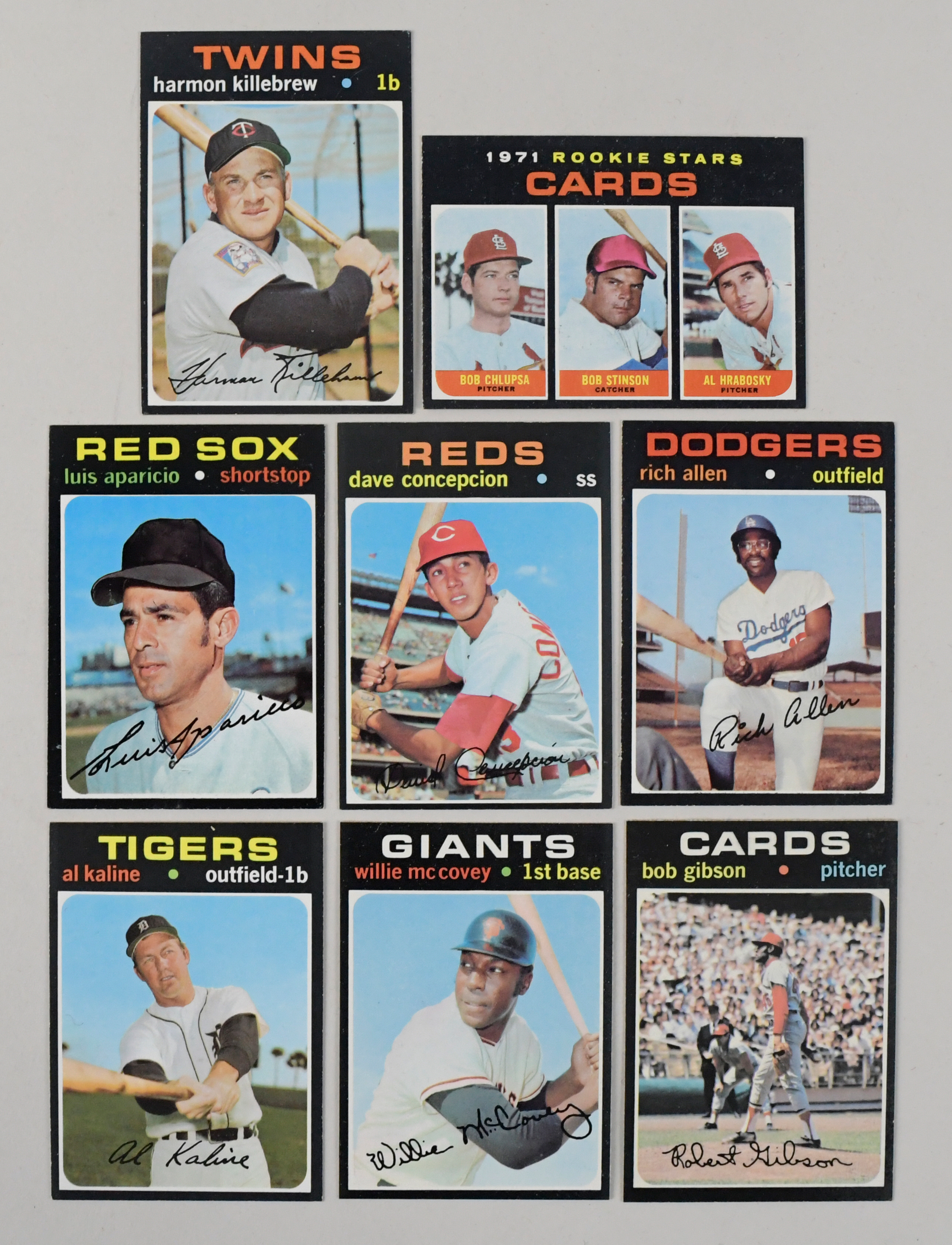 Description:High-grade 1971 Topps partial set (689/752) with HOFers and (103) high numbers (VG/EX-NM/MT). Uncommonly crisp near-complete set for this tough, black-bordered year offers (689) different cards of the (752) issued, including (103) cards from the final high-number series (#s 644-752). Lot includes primarily commons and minor stars, with some Hall of Famers but high-value cards/major stars removed. Highlights include #s 1 Orioles team, 14 Dave Concepcion RC, 45 Catfish Hunter, 50 Willie McCovey, 61-72 League Leaders (missing #67), 117 Ted Simmons RC, 140 Gaylord Perry, 180 Al Kaliene, 230 Willie Stargell, 248 Hoyt Wilhelm, 264 Joe Morgan, 276 George Foster RC, 300 Brooks Robinson, 361 Don Sutton, 380 Ted Williams, 384 Rollie Fingers, 450 Bob Gibson, 550 Harmon Killebrew, 574 Jim Bunning, 594 Al Hrabosky RC, 525 Lou Brock, 650 Richie Allen, 740 Luis Aparicio and more. Near-set, housed in pages and a binder, appears mostly EX/MT-NM/MT with some less. Range: VG/EX-NM/MT. ($1,000-$1,500)