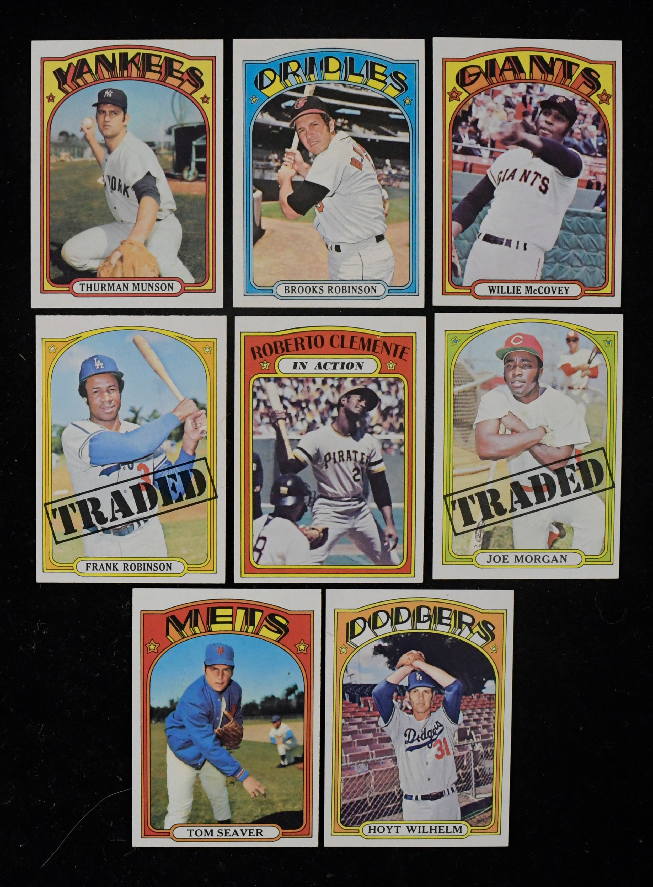 Description:High-grade 1972 Topps partial set (752/787) with HOFers and (121) high numbers (EX-NM/MT). Crisp near-complete set offers (752) different cards of the (787) issued, including (121) cards from the final high-number series (#s 657-787). Lot includes primarily commons and minor stars, with some Hall of Famers but high-value cards/major stars removed. Highlights include #s 1 Pirates team, 37 Carl Yastrzemski, 50 Willie Mays IA, 51 Harmon Killenbrew, 85-96 League Leaders, 100 Frank Robinson, 130 Bob Gibson, 200 Lou Brock, 280 Willie McCovey, 310 Roberto Clemente IA, 441 Thurman Munson, 445 Tom Seaver, 447 Willie Stargell, 530 Don Sutton, 550 Brooks Robinson, 709 Jim Kaat, 752 Joe Morgan Traded, 754 Frank Robinson Traded, 760 Bill Mazeroski, 777 Hoyt Wilhelm and more. Near-set, housed in pages and a binder, appears mostly EX/MT-NM/MT with some less. Range: EX-NM/MT. ($750-$1,250)