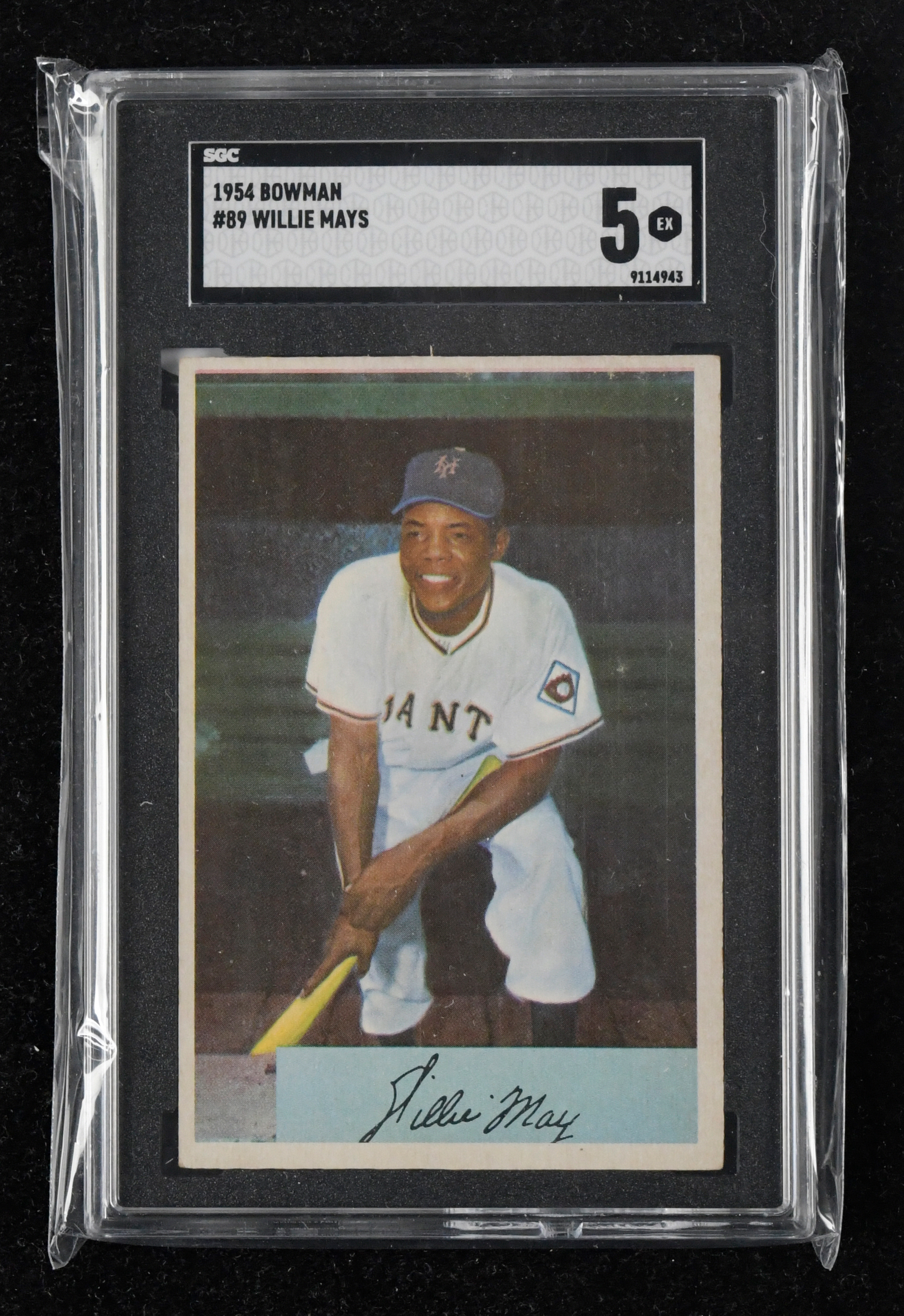 Description:1954 Bowman #89 Willie Mays (SGC 5 EX; eBay authenticated). Classic card of the Hall of Famer is centered to the top and left, with moderate touches of wear to all four corners. Front and back surfaces are clean: SGC 5 EX. Card has passed through the eBay authentication program, with seal intact. ($500-$750)