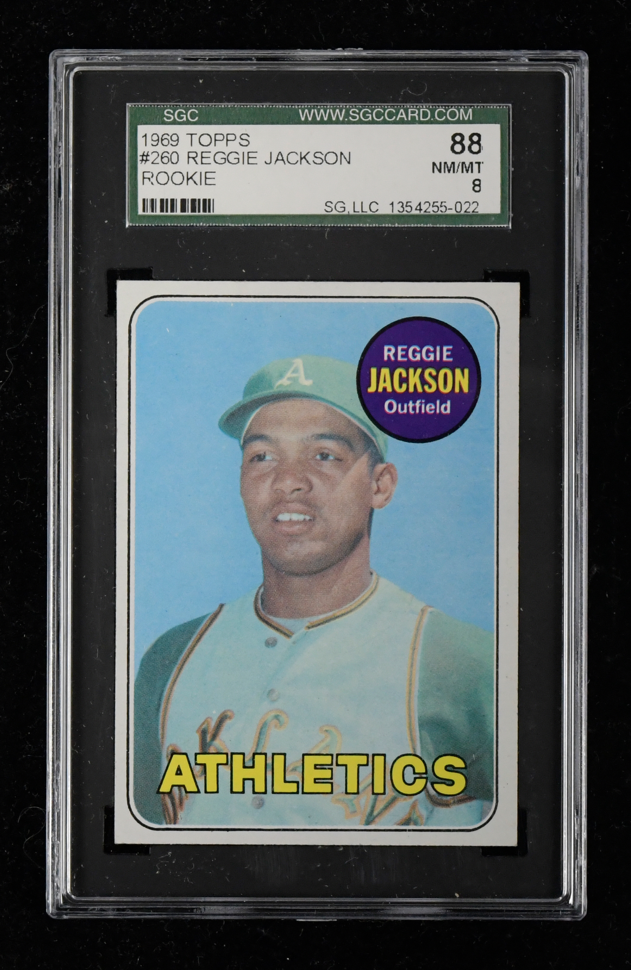 Description:Crisp 1969 Topps #260 Reggie Jackson RC (SGC 8 NM/MT). High-grade rookie card of the Hall of Famer is centered slightly to left and bottom, with vibrant color and four razor-sharp corners. Back is very nicely centered and clean: SGC 8 NM/MT. ($2,500-$3,000)