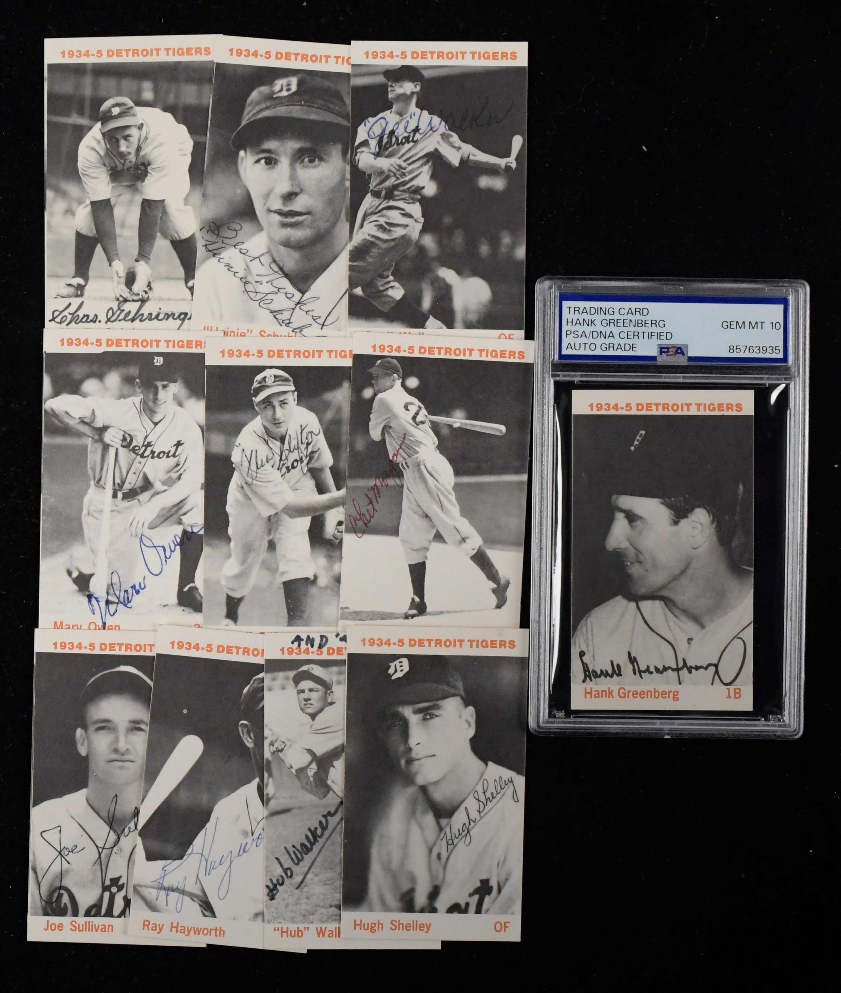 Description:Lot of (11) 1974 TCMA "1934-35 Detroit Tigers" autographed card incl. PSA/DNA "10" Hank Greenberg (EX/MT-NM) Includes Hank Greenberg which has been encapsulated by PSA with the autograph graded "Gem Mint 10." Additional cards include Charles Gehringer, Heinie Schuble, Gee Walker, Chet Morgan, Hub Walker, Ray Hayworth, Hugh Shelley, Marv Owen, Flea Clifton, and Joe Sullivan. Signatures rate 7/8 out of 10 or better. Slightest touch of wear: EX/MT-NM ($400-$600)