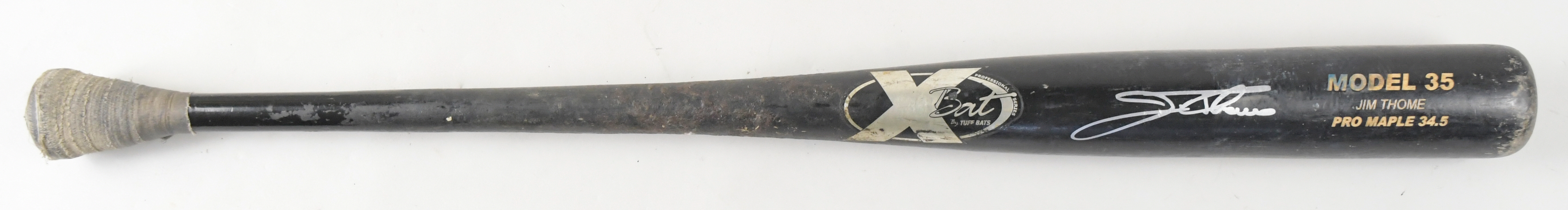 Description:2003-04 Jim Thome autographed professional model baseball bat (PSA/DNA) (EX) X-Bat brand model "35" bat with Thome name block lettered in the barrel measures 34.5" long and weighs 36oz. Uncracked with heavy use including ball/stitch/contact marks which cover the hitting surface. In addition there are cleat marks and the handle has a healthy coat of mota stick. The knob is taped to aid in grip. Signed in silver marker rating 9/10 out of 10. Includes full LOA from PSA/DNA (related to bat) and there is a JSA sticker in the cupped end (related to autograph - note JSA COA is not included): EX ($500-$1,000)