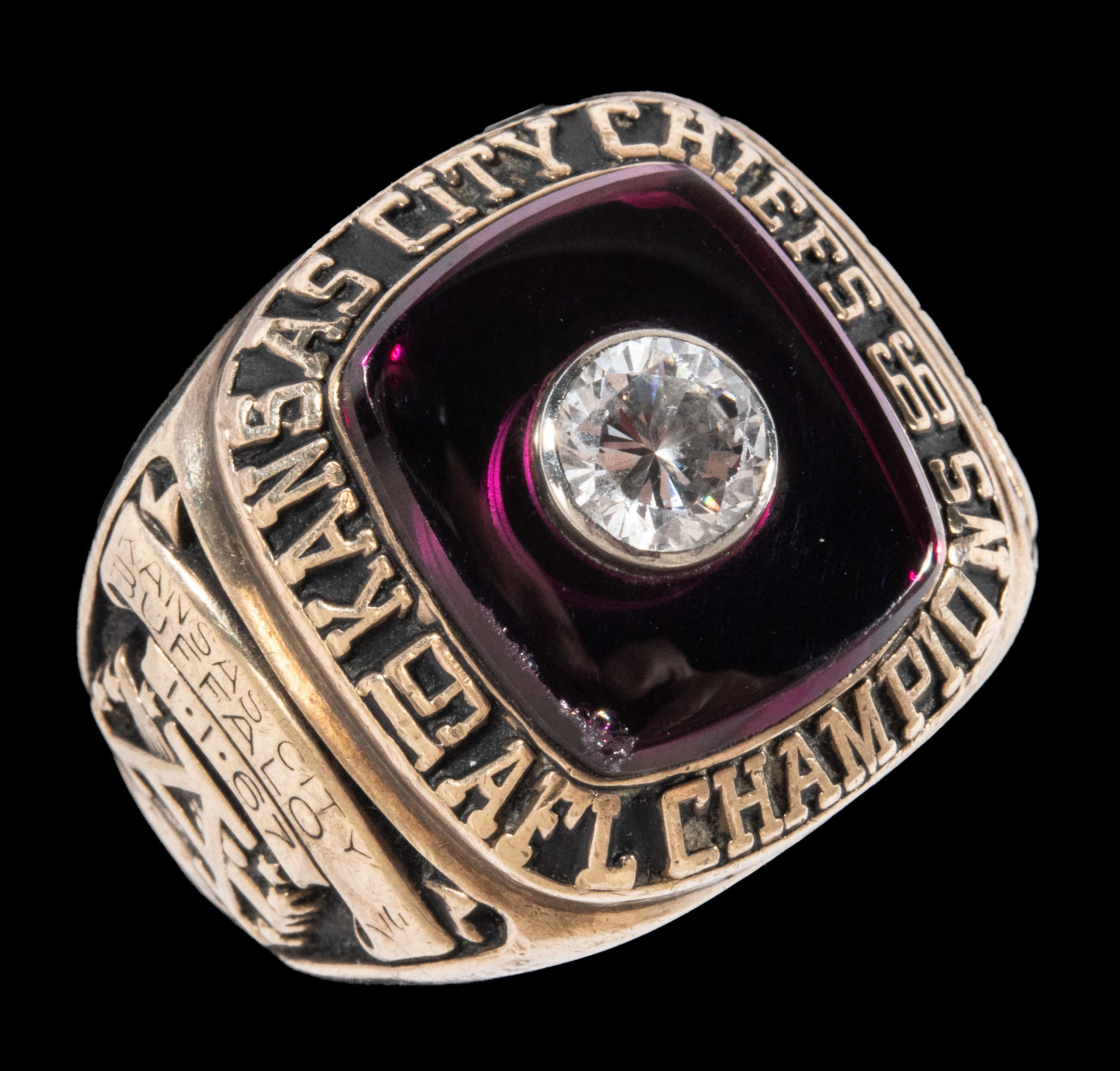 Description:Lloyd Wells 1966 Kansas City Chiefs AFL Champions 10K gold ring - NFL's 1st African American scout (VG/EX-EX). 10K gold size 14.5 (re-sized) ring weighing 1-oz. with CZ stone set on red stone face surrounded by "Kansas City Chiefs 1966 AFL Champions" text. One side has 1-1-67 AFL Championship game score above the AFL logo, with text below faded away. The other has "WELLS" name above Chiefs logo, with text below also faded away. Resized band has caused the interior stampings to no longer be present. The ring appears to have been worn over an extended period of time, and the original stone has been removed from the face, with this replacement face showing impressive eye-appeal. Tough 1960s era championship ring from a formative AFL franchise: VG/EX-EX ($2,000-$4,000)
