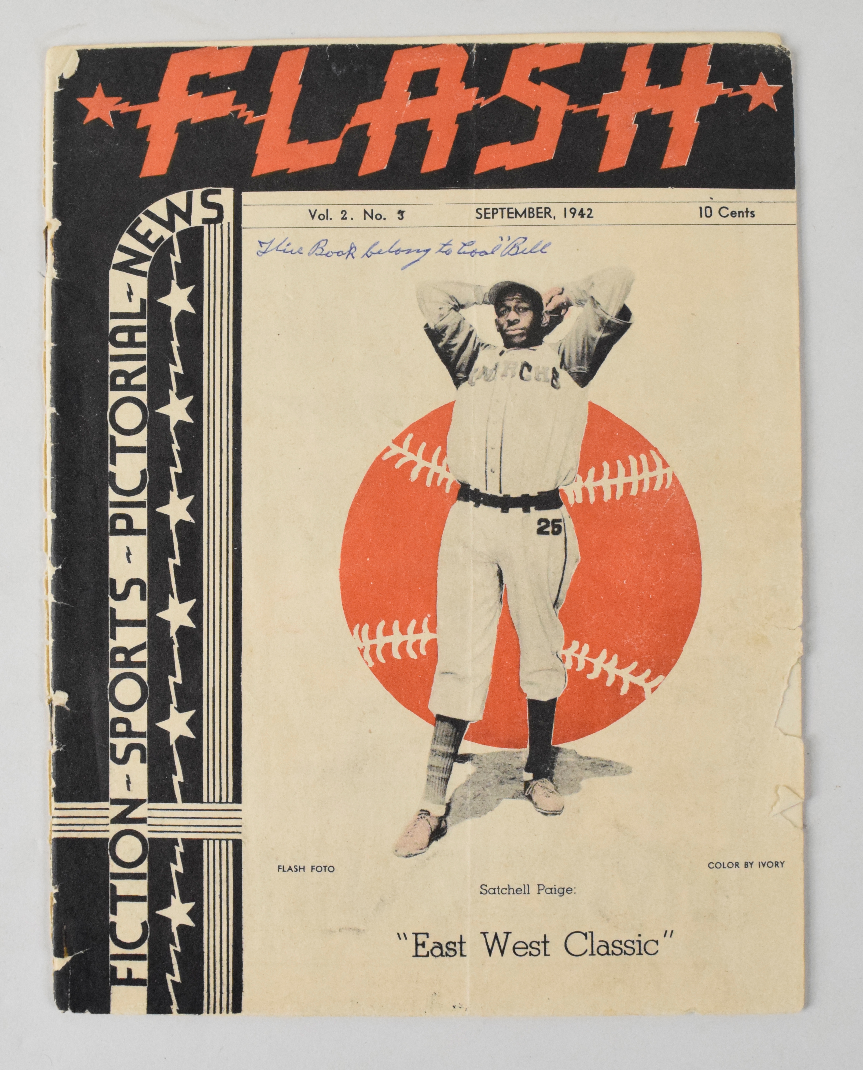 Description:1942 Flash Magazine - Satchel Paige and the East West Classic (signed and inscribed from Cool Papa Bell Collection) (See description) Original issue of Flash magazine which was published in September of 1942 has Satchel Paige pictured on the cover. Interior has several pages which cover Paige, the East West Negro League All Star Game, and a Rube Foster memorial. In addition there are many advertisements related to African American businesses. Signed "This book belong to Cool Bell" on the cover in ink rating 8/9 out of 10. It originates from Bell himself and was gifted to a long time sports memorabilia dealer whom had several paid autograph signings with Bell in the early 1980s. Magazine displays nicely however the covers (which have chipping, tears, and other wear) are separated. These could certainly be resecured to the balance of the magazine by a professional conservator: See description ($500-$1,000)