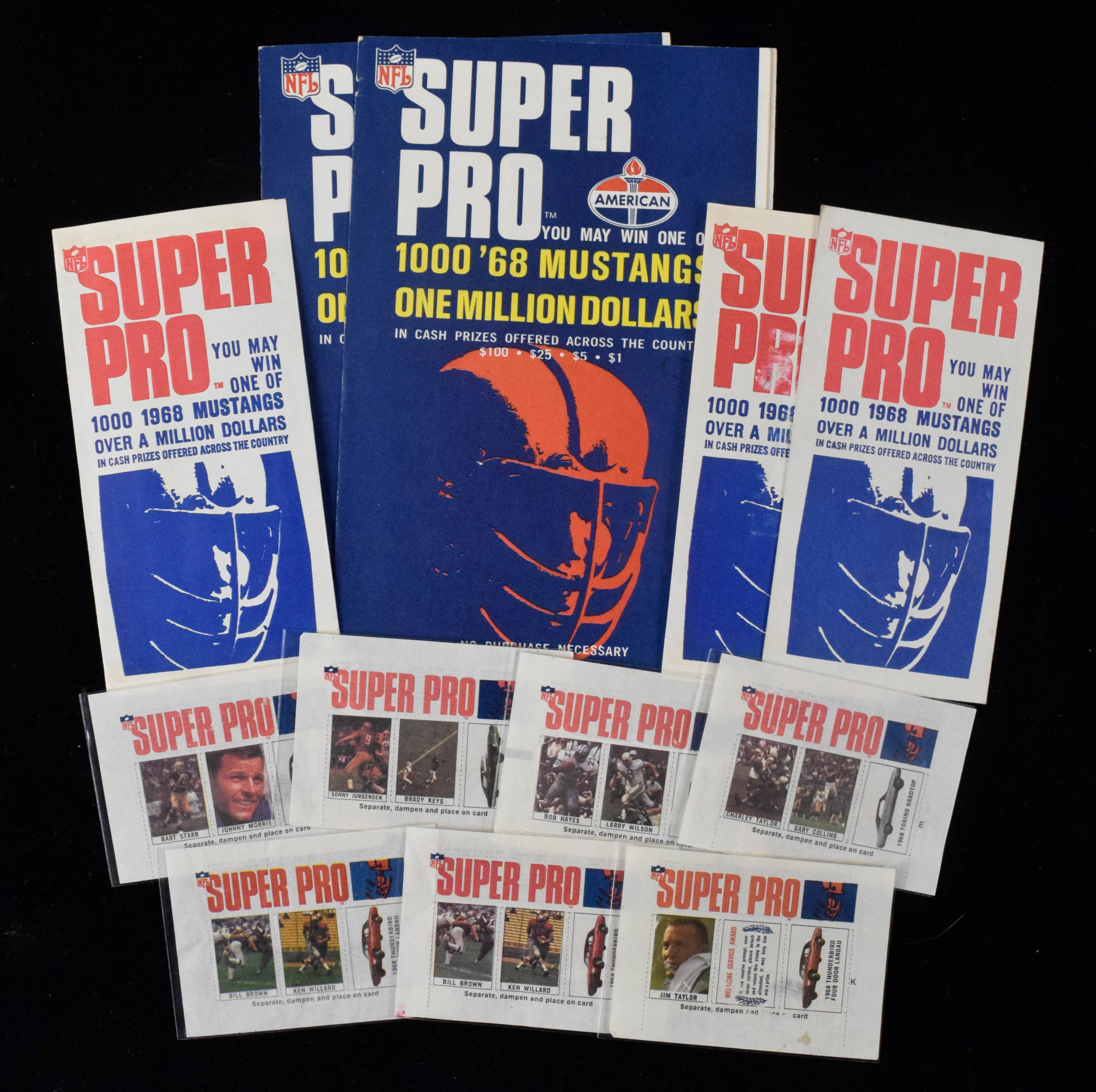 Description:1967 American Oil Co. NFL Super Pro stamps lot with related items (see description). Includes stamp blocks A Bart Starr / Johnny Morris, B Sonny Jurgensen / Brady Keys, D Larry Wilson / Bob Hayes, E Charley Taylor / Gary Collins, (2) F Bill Brown / Ken Willard, and K Jim Taylor / Welcome Service Award; Block A Starr/Morris still in envelope; Block D Hayes/Wilson still in envelope; an unopened envelope containing unknown block, and (2) partially used sweepstakes entry cards. Most have back damage which is common and expected due to removal from envelopes.