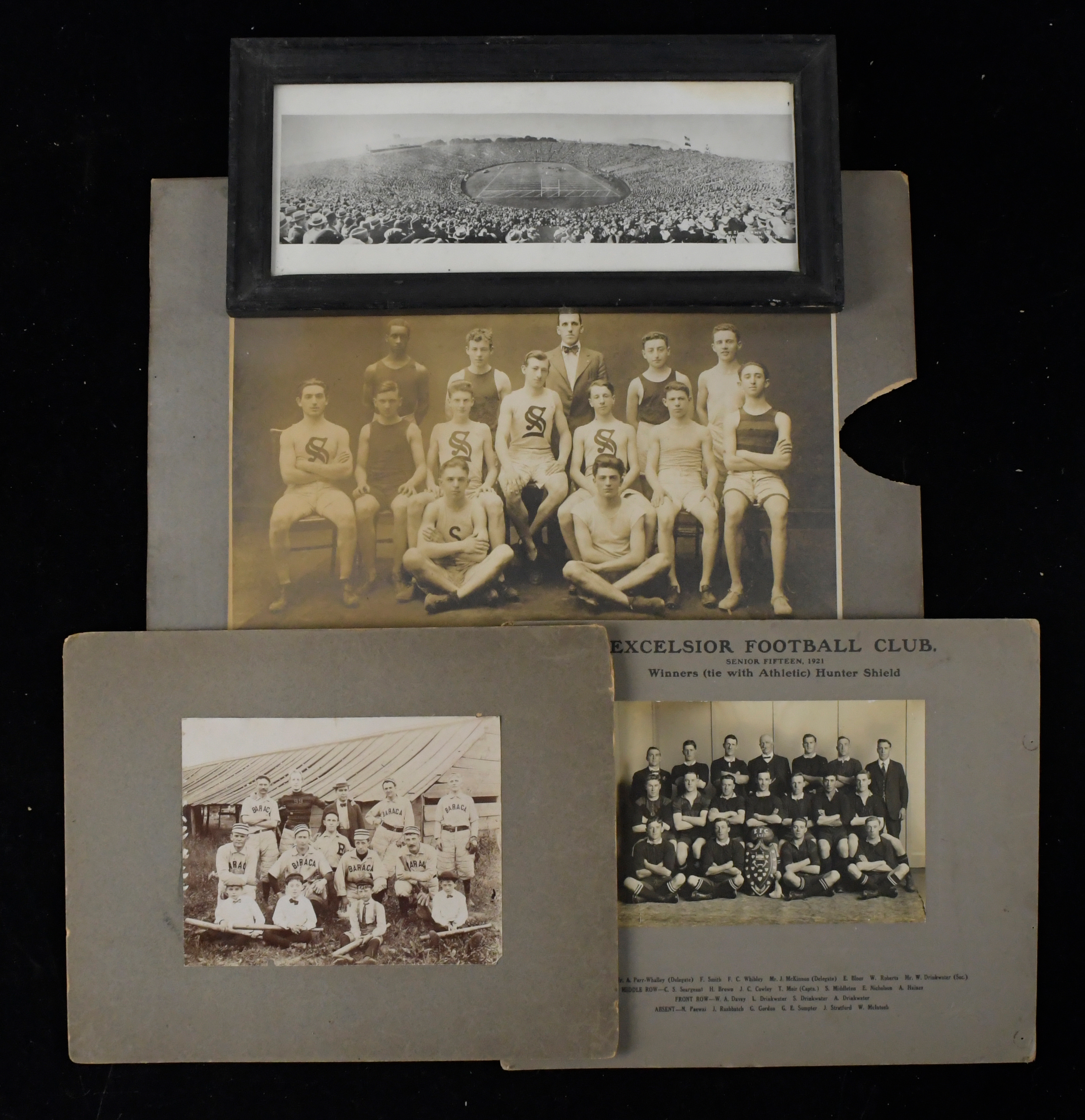Description:Lot of (4) vintage sports photographs, c.1899-1929 (GD-VG/EX). Includes 6.5"x8" c.1899 Baraca baseball team photo (mounted on 11"x14" backing), 1900s 11"x16" photo picturing what appears to be a high school track & field team (mounted on 16"x20" backing which has moisture stains), 5.75"x8" 1921 Excelsior Football Club photo (mounted on 11.5"x14" backing), and 7.5"x16" framed 1929 Army at Yale football game photo (wear visible at top right corner): GD-VG/EX