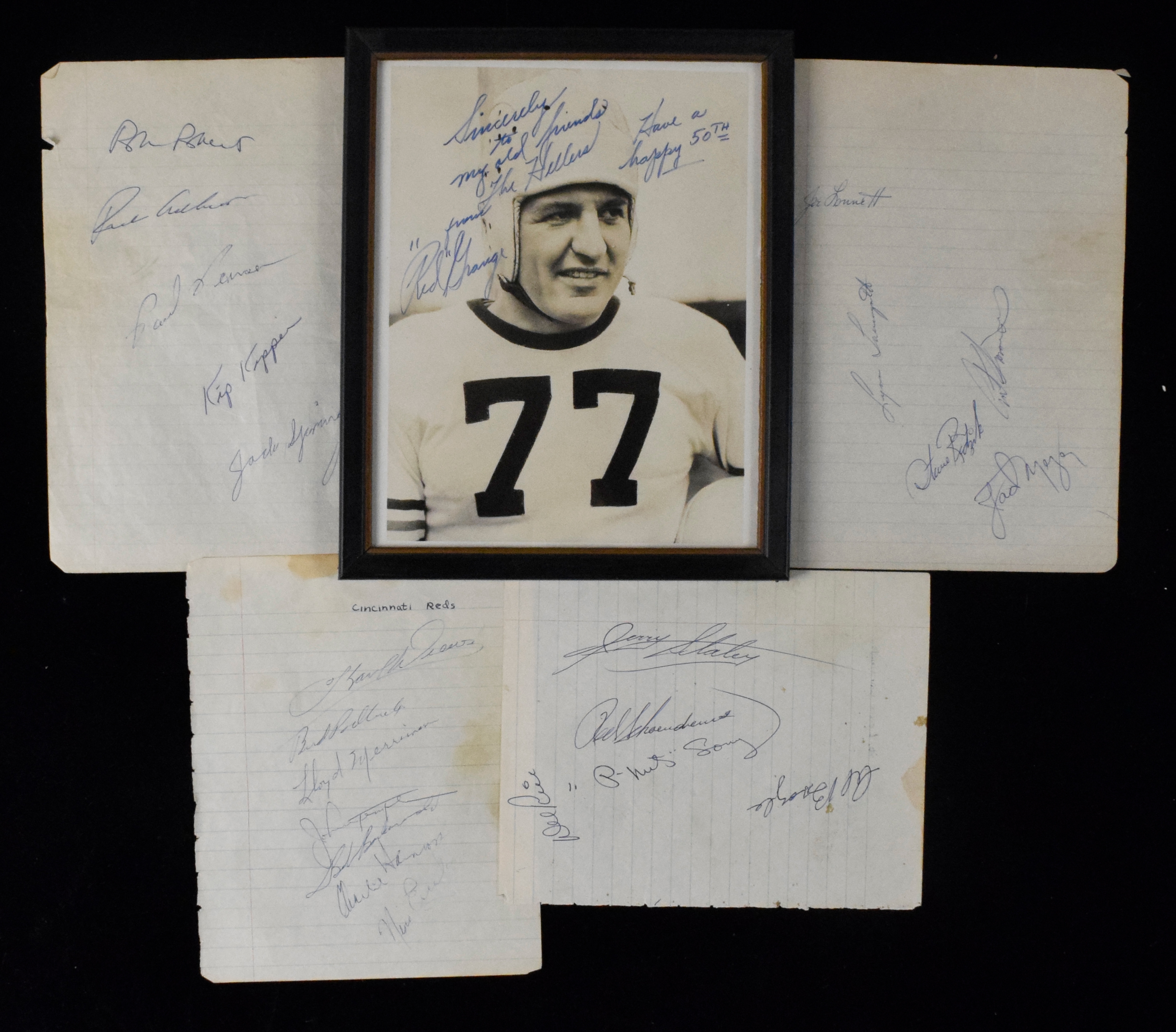 Description:Red Grange signed photograph plus mid 1950s baseball autographs (VG/EX-EX/MT). Includes a framed 8"x10" photo signed by Red Grange (personalized); and (4) sheets of notebook pages signed by various Philadelphia Phillies, Cincinnati Reds, and St. Louis Cardinals with a total of (35) autographs: Richie Ashburn, Robin Roberts, Red Schoendienst, Curt Simmons, P-Nuts Lowrey, Wally Moon, John Temple, Kip Kipper, Stan Lopata, Mel Clark, Marv Blaylock, Charlie Harmon, Jack Spring, Karl Drews, Cot Deal, (2) Jerry Staley, Tom Alston, Joe Presko, Al Brazle, Del Rice, Joe Lonnett, Bud Podbielan, Steve Ridzik, Jack Meyer, Lloyd Merriman, Nino Escalera, Lynn Lovenguth, Tom Casagrande, Lou Ortiz, and others. Signatures rate 6/7 to 10 (avg 8) out of 10: VG/EX-EX/MT