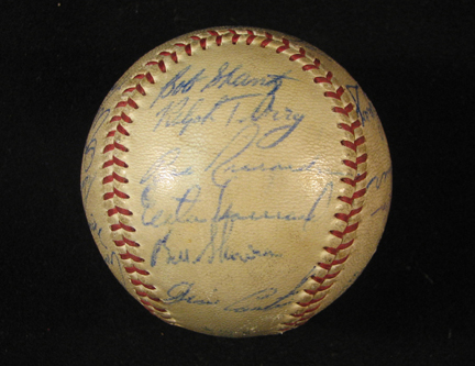 Description:1959 New York Yankees team-signed baseball. "Cronin" AL ball signed by (24) members incl. Berra, Slaughter, Larsen, Carey, Bauer, Skowron, Howard, and Kubek. The Mantle sig is clubhouse: EX