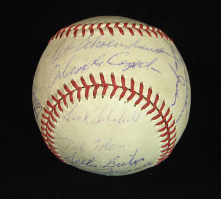Description:1968 St. Louis Cardinals team-signed baseball. Spalding W.Giles NL ball signed by (22) including Roger Maris, Bob Gibson, Lou Brock (sig rates 2/3 out of 10), Red Schoendienst (sweet spot), Orlando Cepeda (sweet spot), Steve Carlton (5/6 out of 10), Curt Flood, Tim McCarver, Julian Javier, Ray Washburn, and others. Signatures rate 6/7 out of 10 on average: EX-EX/MT