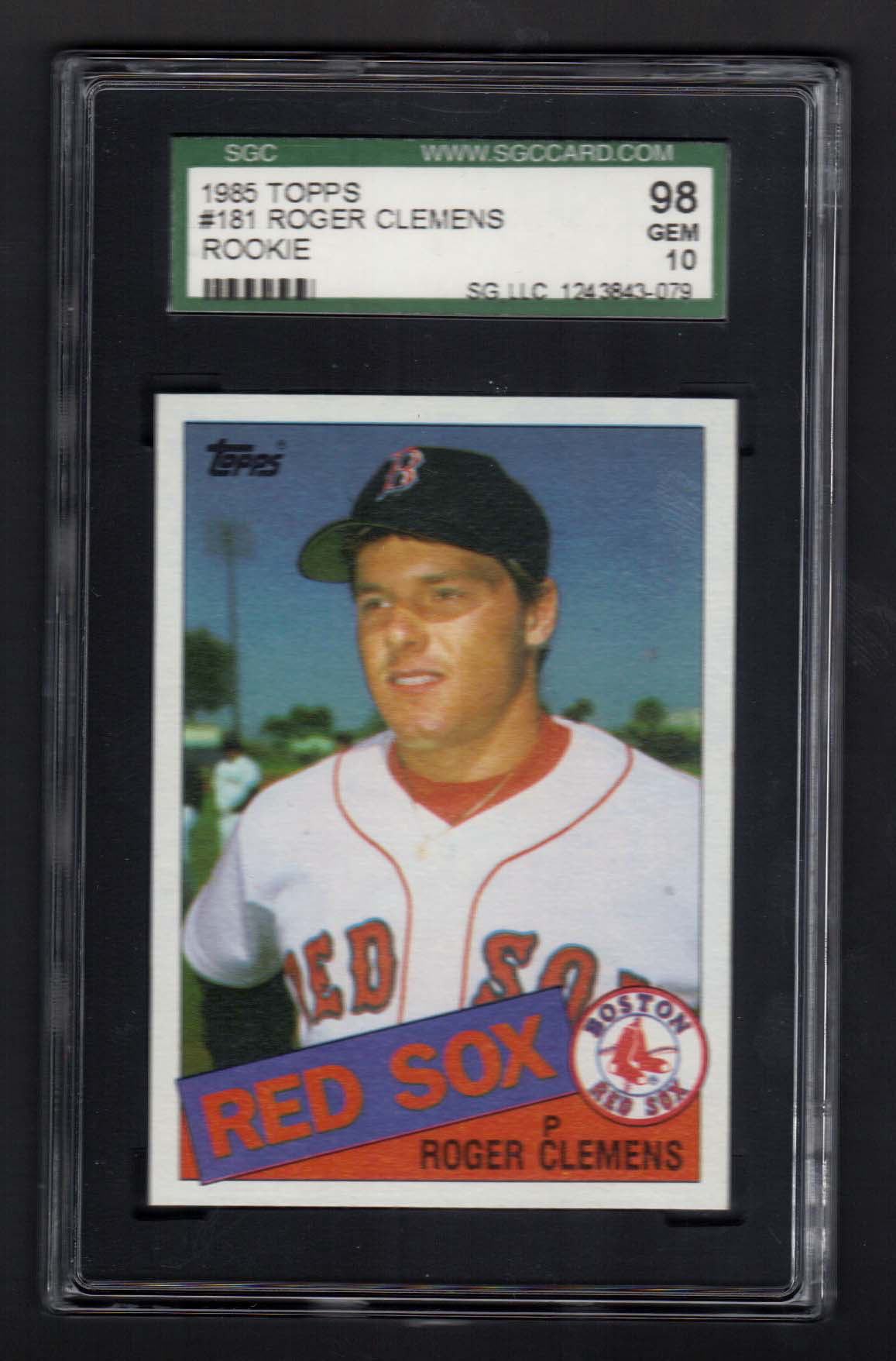 1985 Topps #181 Roger Clemens rookie card. Perfectly centered with four untouched corners. Graded SGC 98 Gem Mint.