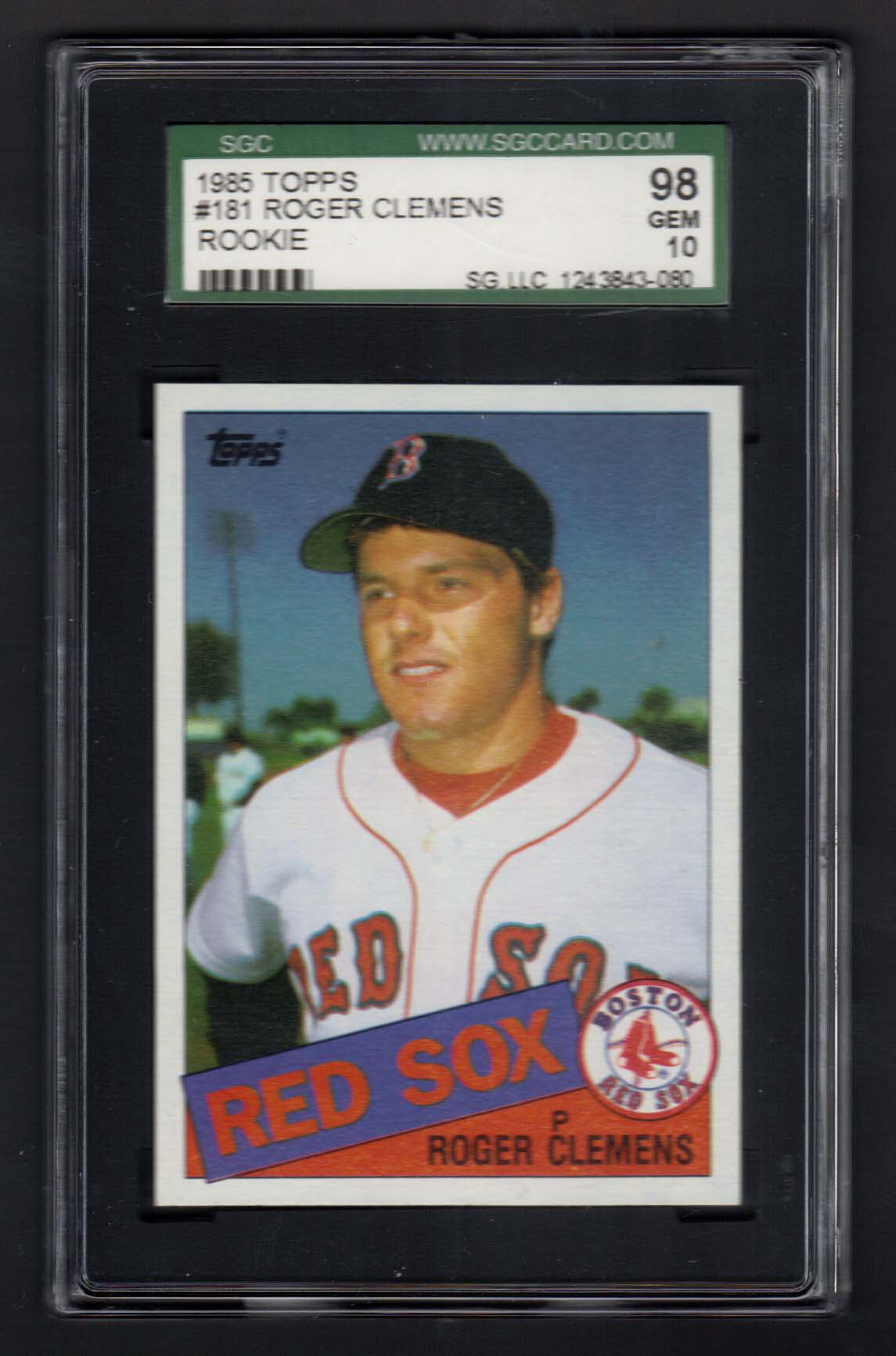 1985 Topps #181 Roger Clemens rookie card. Perfectly centered with four untouched corners. Graded SGC 98 Gem Mint.