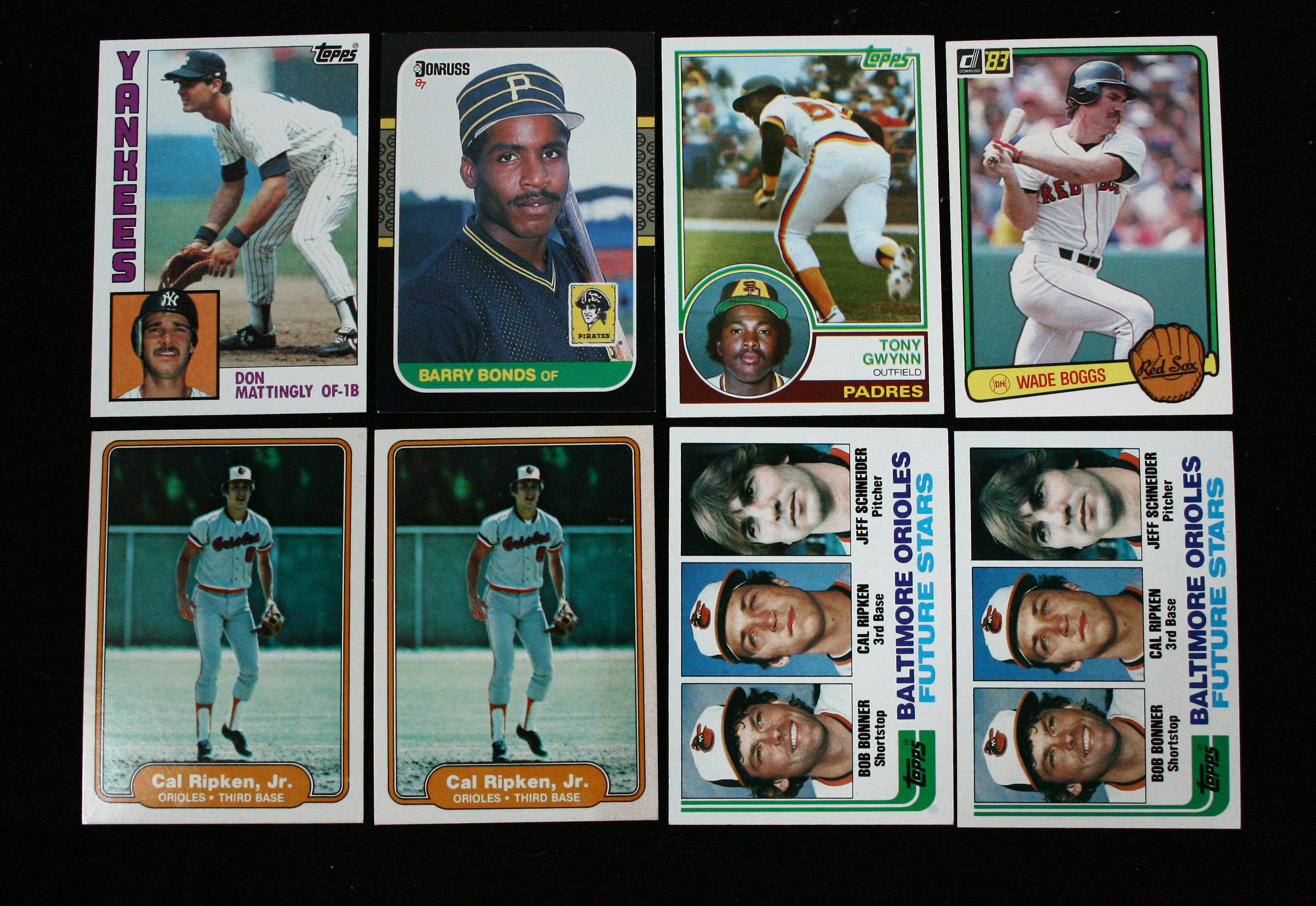Lot of (154) baseball rookie cards. Incl. (4) 1982 Topps #21 Ripken, (2) 1982 Fleer #176 Ripken, (2) 1987 Donruss #36 Maddux, (6) 1984 Donruss #68 Strawberry, (51) 1987 Topps #366 McGwire, (28) 1981 Donruss #538 Raines, (15) 1981 Topps #479 Raines; and (46) misc. other rookies incl. Boggs, Gwynn, Bonds, Mattingly, F.Thomas, Canseco, Baines, Molitor, and G.Carter. Most grade EX/MT-NM. Range VG-MT