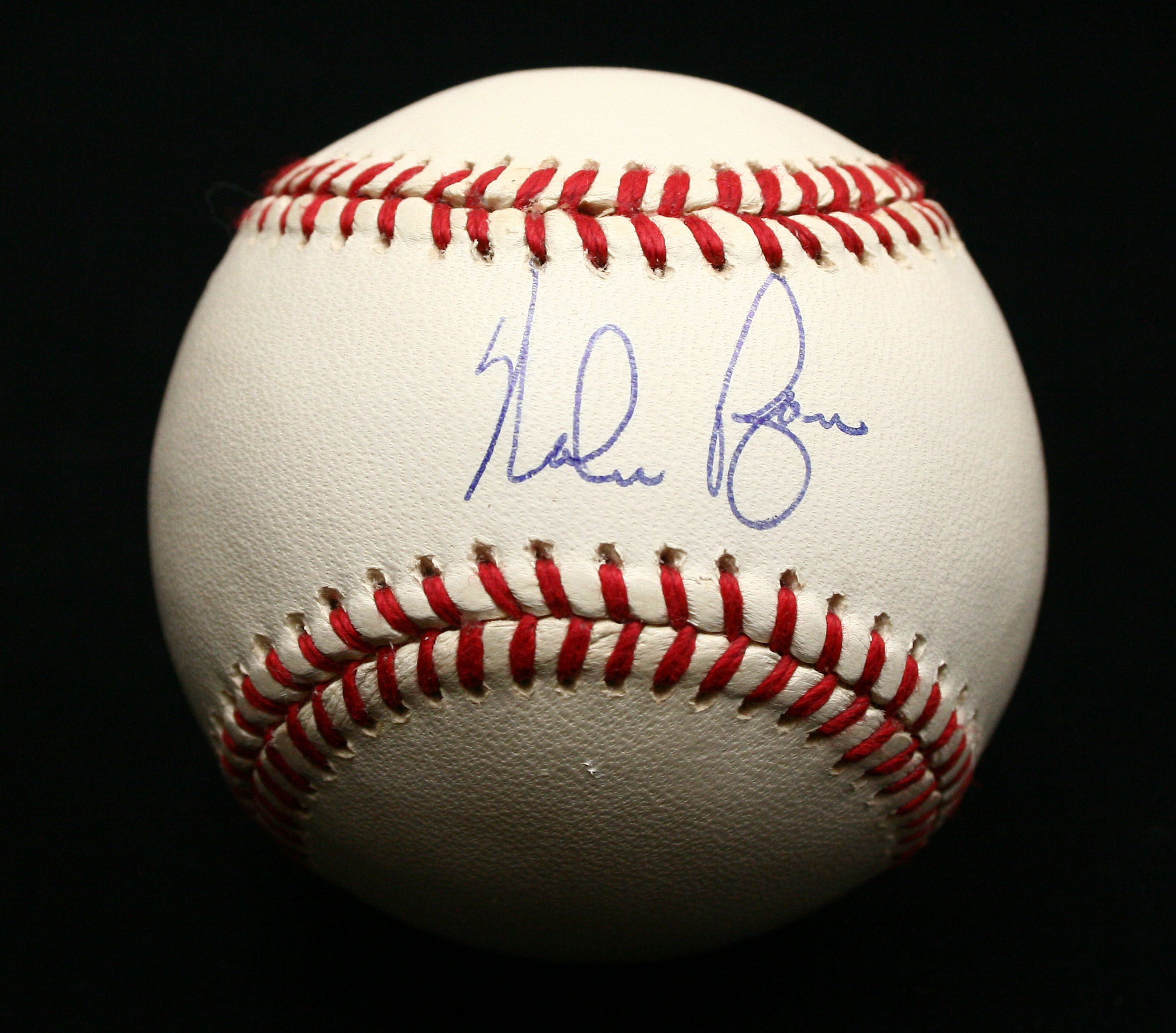 Nolan Ryan single-signed baseball. B.Brown AL ball signed by Ryan in blue ink on the sweet spot. Signature rates 9 out of 10: NM