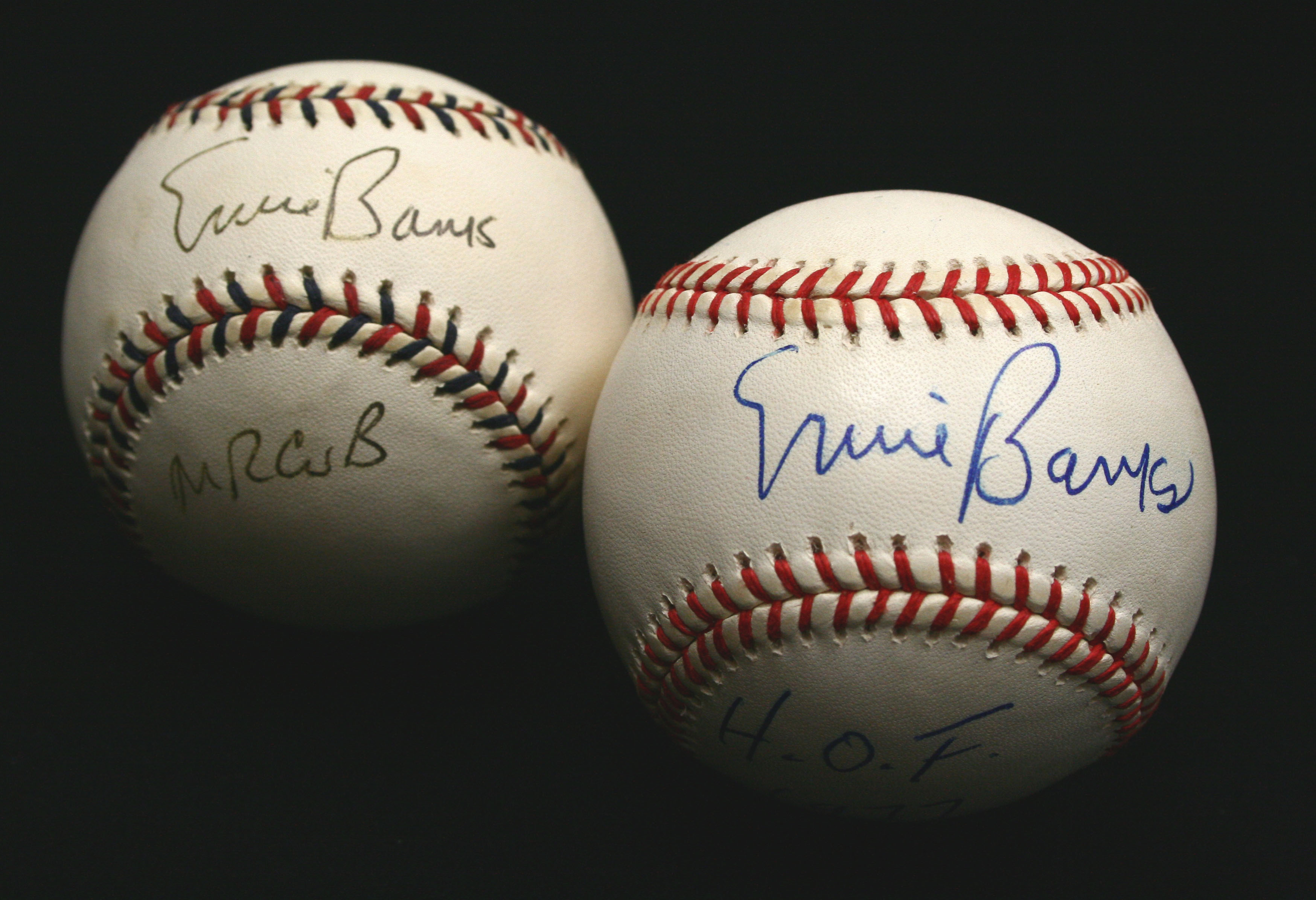 Description:Lot of (2) Ernie Banks single-signed baseballs. Incl. a A.Selig 2000 All-Star game ball signed on the sweet spot with the inscription "Mr. Cub" on a side panel; and a W.White NL ball signed on the sweet spot with the inscription "HOF 1977" on a side panel: EX/MT-NM