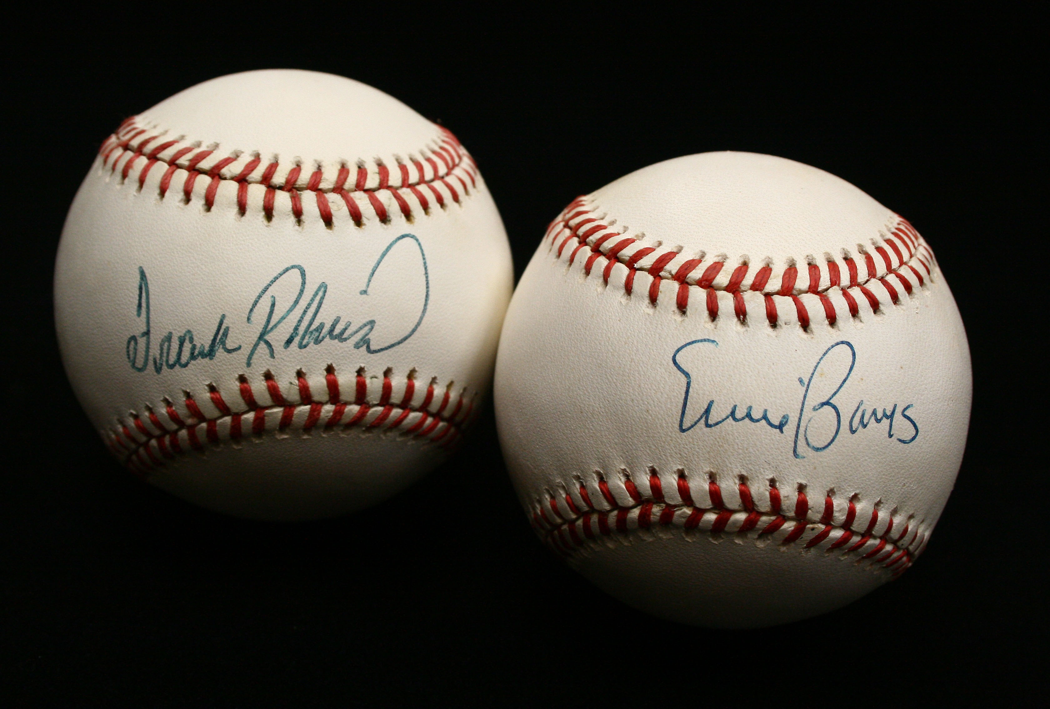 Description:Ernie Banks and Frank Robinson single-signed baseballs. Incl. a W.White NL ball signed by Banks and a B.Brown AL ball signed by Robinson. Both are signed in ink on the sweet spots: EX/MT-NM