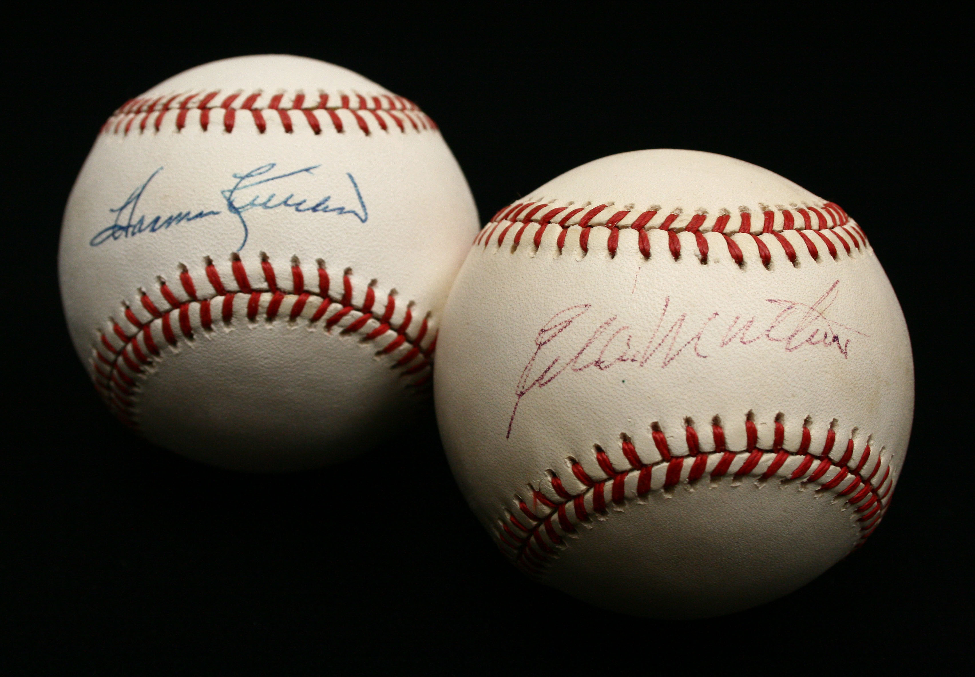 Description:Harmon Killebrew and Eddie Mathews single-signed baseballs. Incl. a B.Brown AL ball signed by Killebrew and a W.White NL ball signed by Mathews (light signature rating 6/7 out of 10). Both are signed in ink on the sweet spots: EX-NM