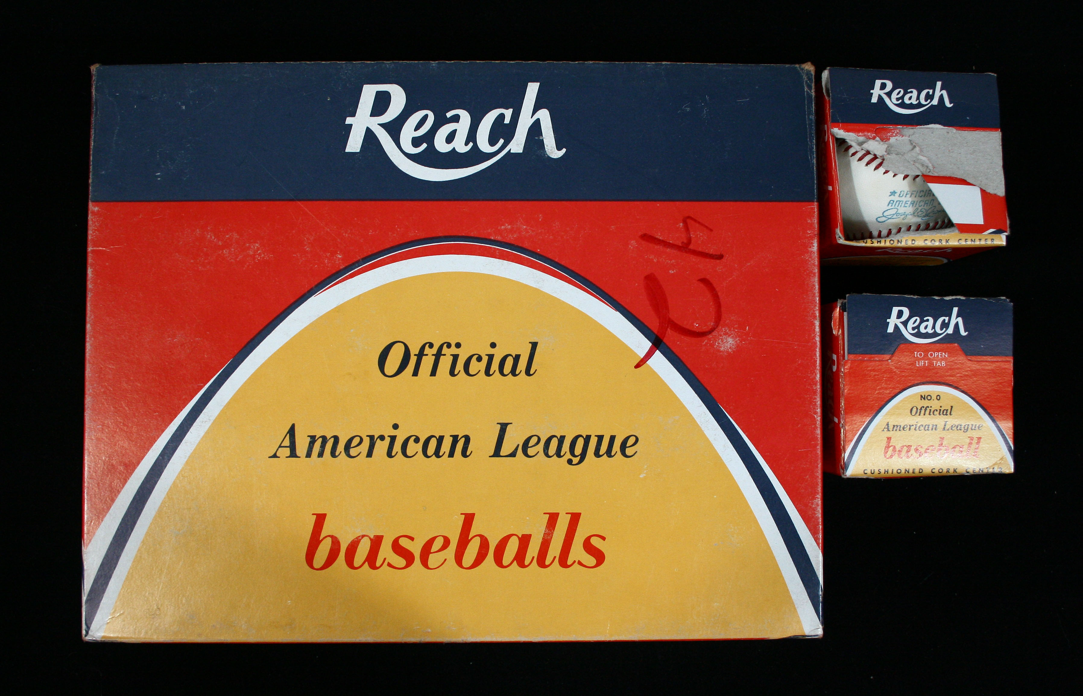 Description:Lot of (2) vintage Reach Joseph E. Cronin Official American League baseballs and display box c. 1960s. Both balls are unused in their original boxes. One of the balls has very minimal toning while the other has light toning on all panels. Both of the boxes are opened and have various amounts of wear from the manner in which they were opened. Also incl. an original one dozen display box showing light wear overall (the #42 is written in marker on the lid). Balls: EX/MT, Ball boxes: VG-VG/EX, Display box: EX
