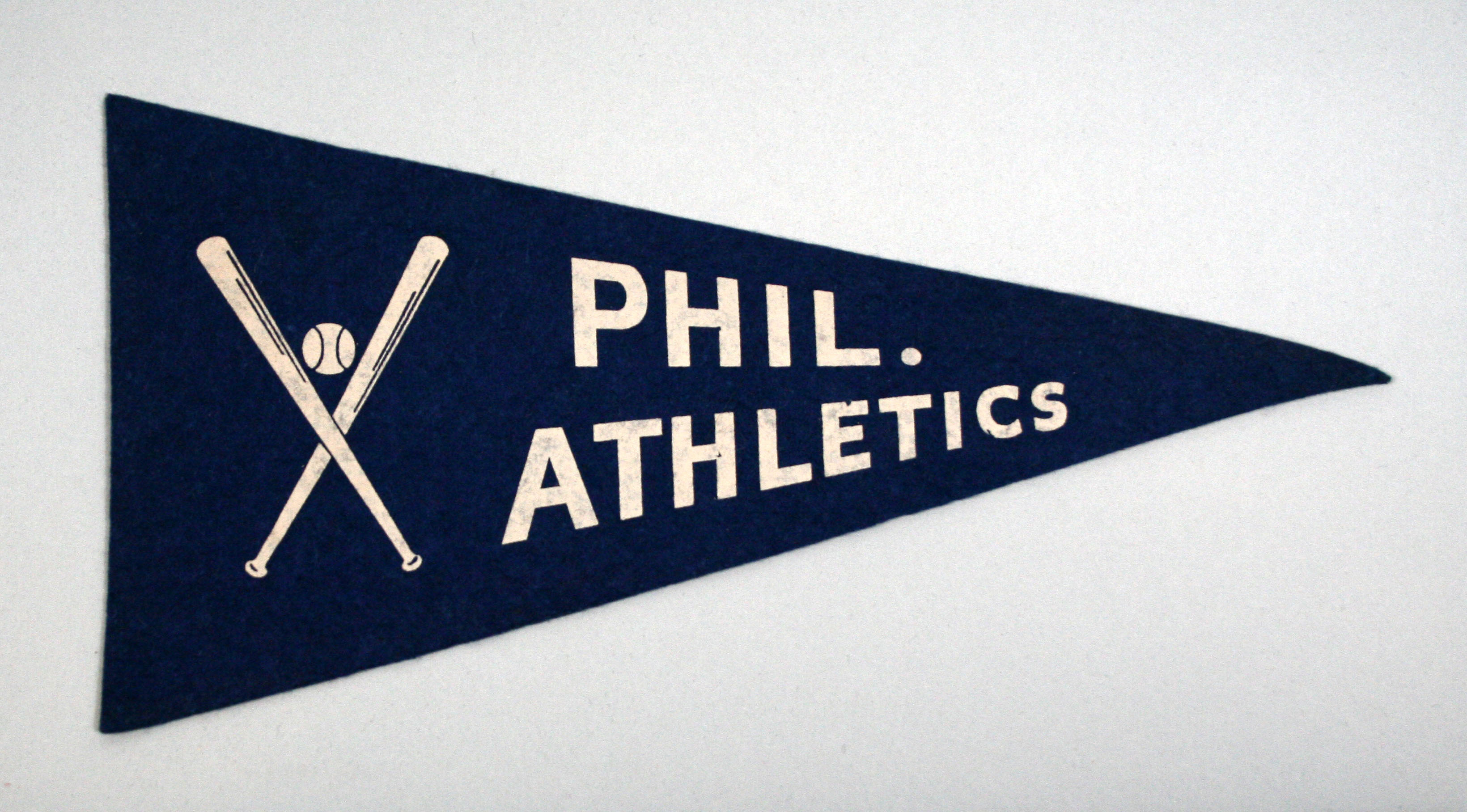 Description:Vintage Philadelphia Athletics mini pennant c. 1930s-40s. 11.5" dark blue pennant with off-white "Phil. Athletics" lettering and crossed bats logo. Exhibits very minimal wear: EX/MT