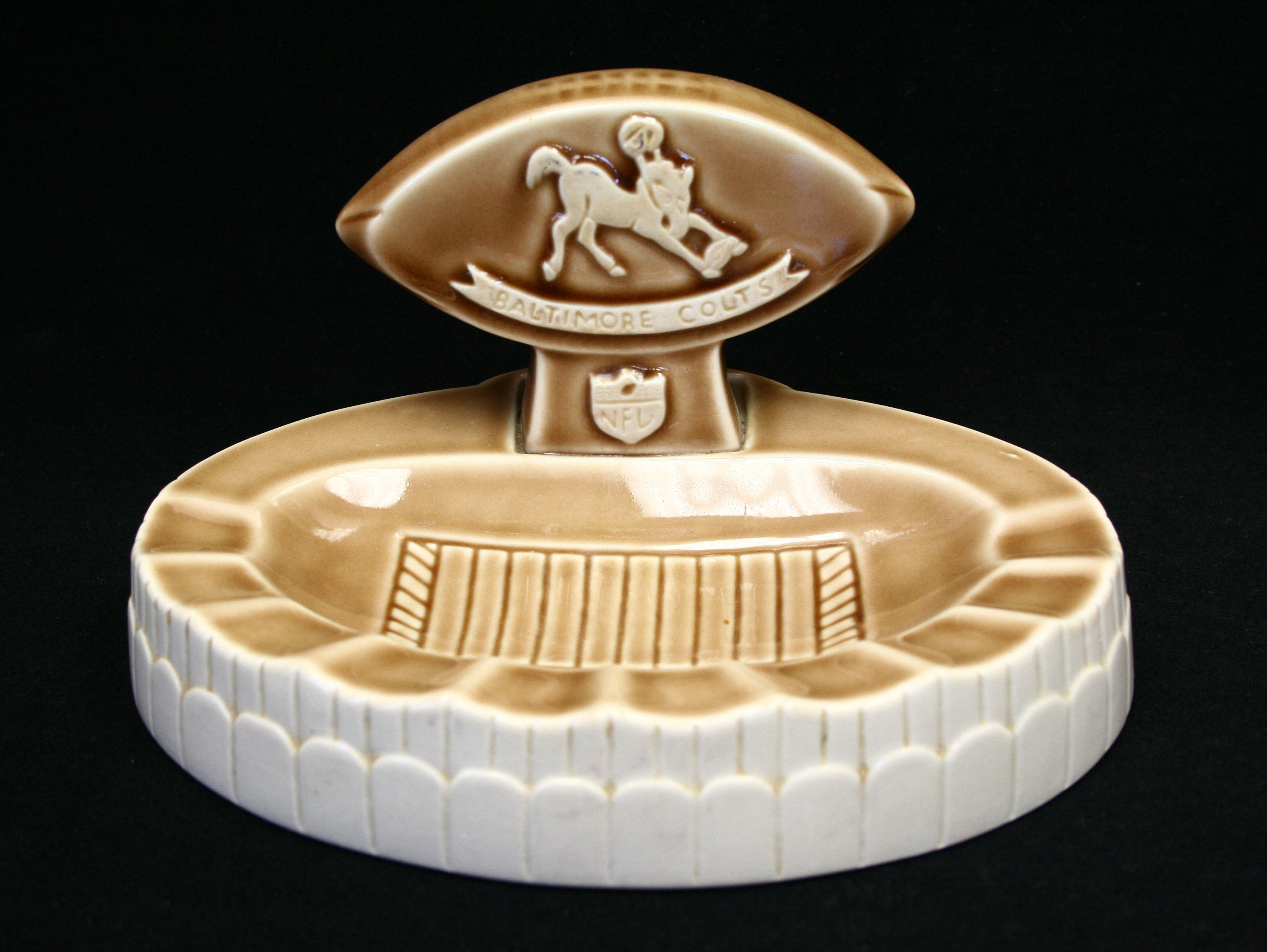 Description:1960 Baltimore Colts football stadium ashtray. Original ashtray made by Weico Co. (It is marked "Weico Co. Inc. Chicago 22 USA - 1960 NFL Enterprises"). Measures 8" long, 5.5" deep, and 5" tall. Exhibits little to no wear: EX/MT-NM