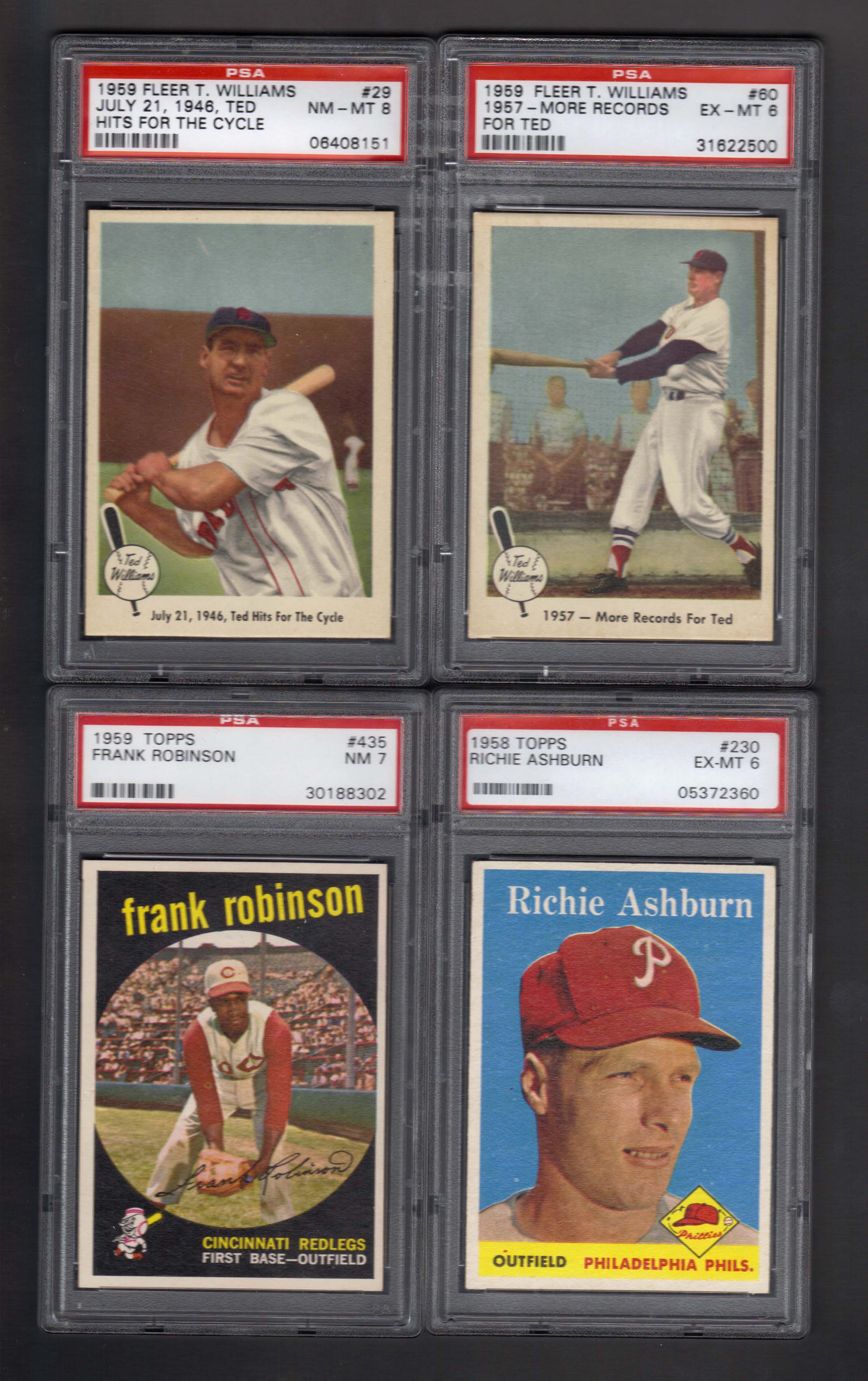Lot of (5) PSA graded baseball HOFer cards. Incl. a 1958 Topps #230 Richie Ashburn (PSA 6 EX/MT), 1959 Topps #435 Frank Robinson (PSA 7 NM), 1959 Fleer #29 Ted Hits For The Cycle (PSA 8 NM/MT), 1959 Fleer #60 More Records For Ted (PSA 6 EX/MT), and 1973 Topps #255 Reggie Jackson (PSA 7 NM).