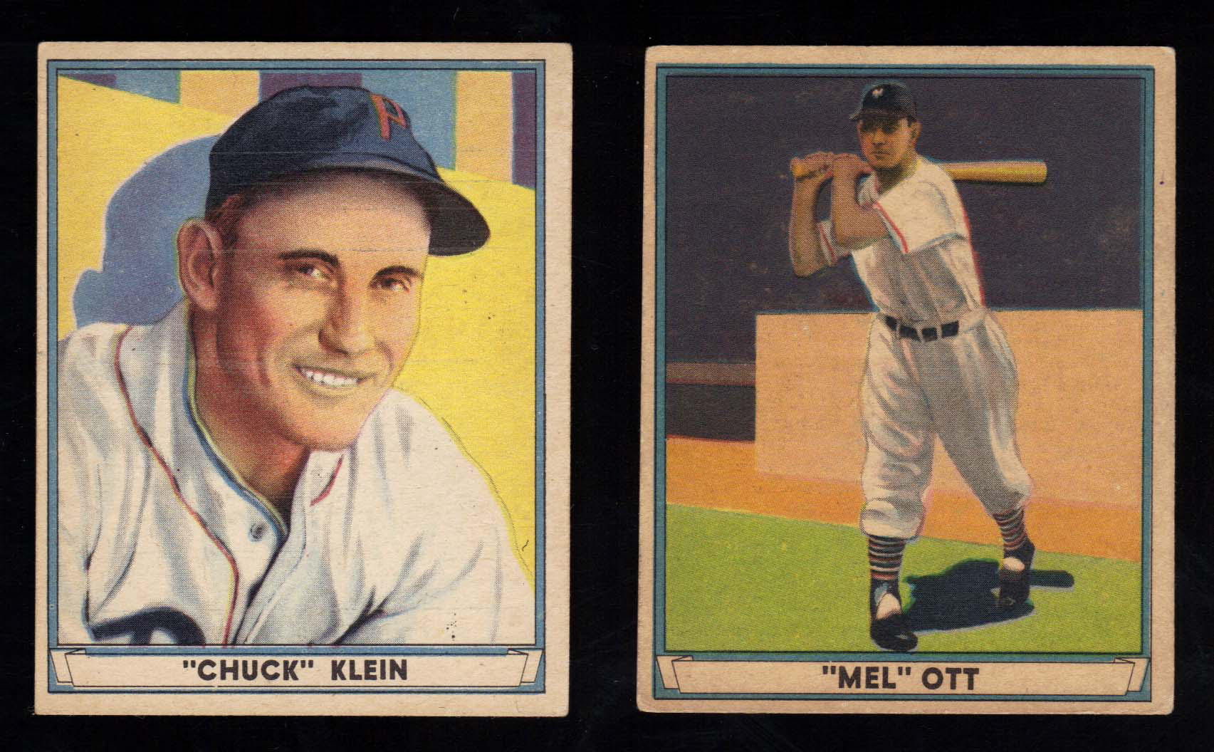 Description:Lot of (2) 1941 Play Ball HOFer cards. Incl. #s 8 Mel Ott (exhibits even rounding on all four corner, VG/EX) and #60 Chuck Klein (exhibits light wear on all four corners, EX).