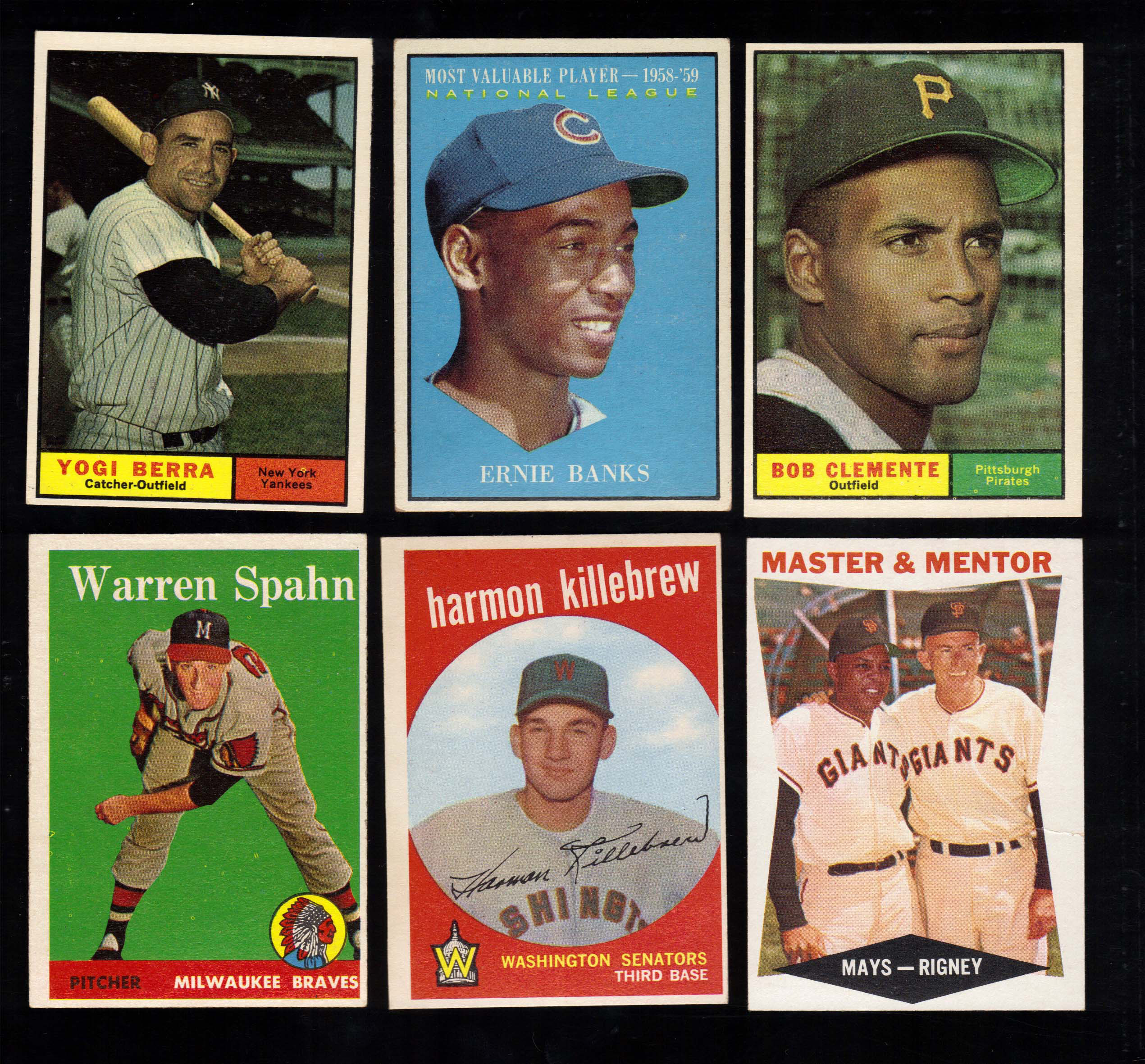 Lot of (11) 1958-1961 Topps baseball star cards. Incl. (2) 1958: #s 270 Spahn (EX) and 482 Banks AS (EX/MT); 1959 #515 Killebrew (EX/MT); (5) 1960: #s 7 Mays/Rigney (VG), 210 Killebrew (NM), 264 Roberts (NM), 316 McCovey (EX/MT), and 420 Mathews (EX/MT); and (3) 1961: #s 388 Clemente (NM), 425 Berra (EX/MT), and 485 Banks (EX).