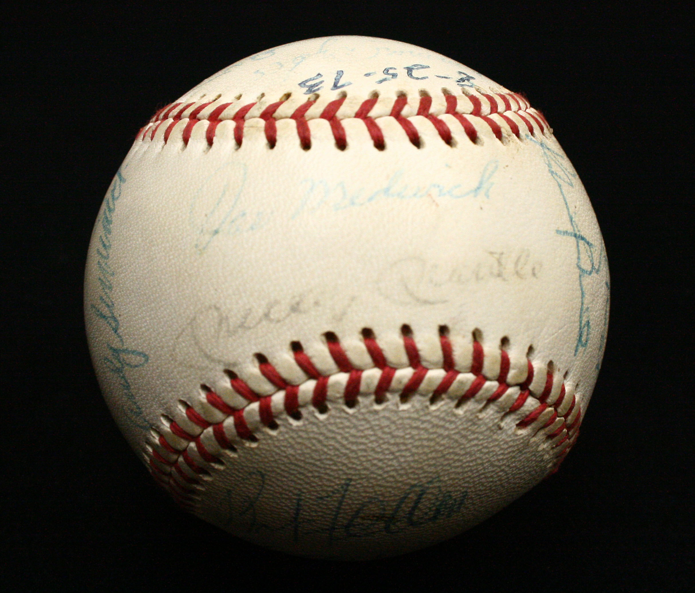 Description:1973 HOF'er/Old Timers multi-signed baseball. Off-white Feeney NL ball signed by (20) players incl. Mickey Mantle, Joe Medwick, Nellie Fox, Elston Howard, Lefty Grove, Bob Feller, Red Ruffing, Mickey Vernon, Stan Musial, Jimmie Dykes, Luke Appling, Hoyt Wilhelm, Curt Simmons, Elroy Face, Wally Moses, Dick Groat, Robin Roberts, Andy Seminick, and Gene Woodling. Majority of the signatures rate 8 out of 10. Range 6-9 out of 10. Incl. an auction LOA from James Spence Authentication: EX/MT