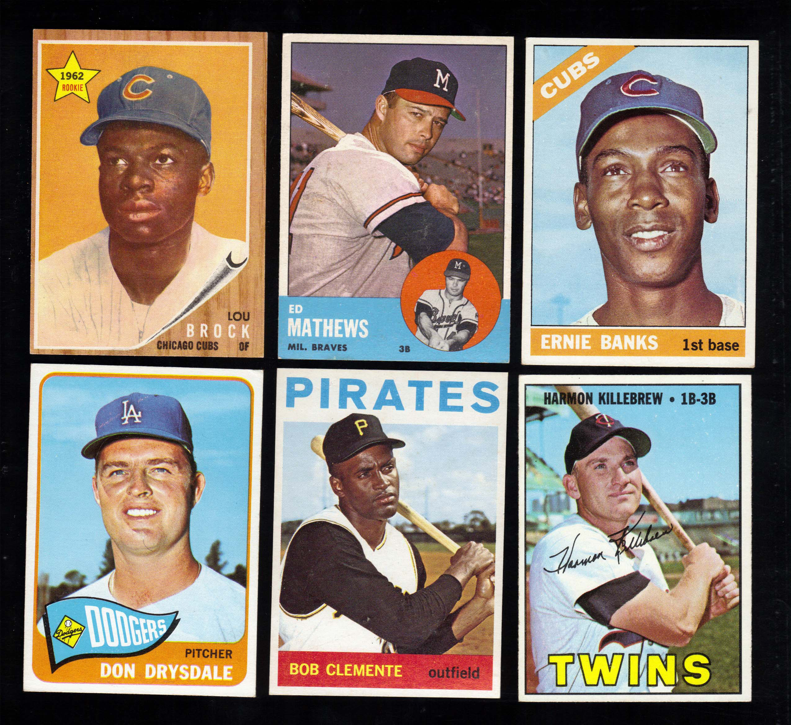 Lot of (12) 1962-1967 Topps baseball star cards. Incl. 1962 #387 Brock (EX/MT (OC)), (5) 1963: #s 25 Kaline (EX), 275 Mathews (EX-EX/MT), 320 Spahn (EX/MT), 380 Banks (EX/MT), and 415 Gibson (VG/EX-EX); 1964 #440 Clemente (EX); 1965 #260 Drysdale (EX-EX/MT); 1966 #110 Banks (EX), and (4) 1967: #s 55 Drysdale (NM), 100 Robinson (EX/MT), 215 Banks (EX), and 460 Killebrew (EX/MT).