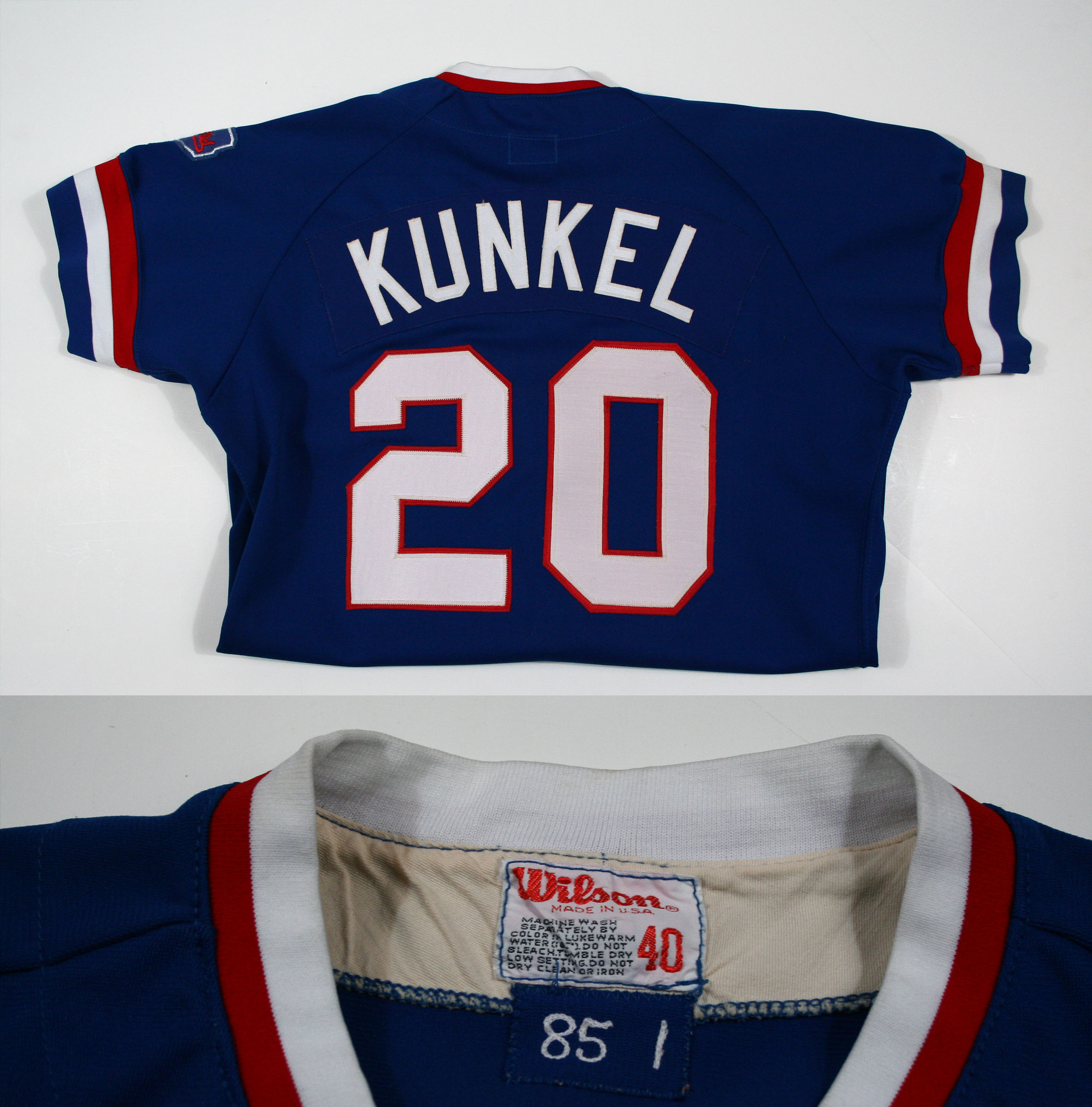 Description:1985 Jeff Kunkel Texas Rangers jersey. Blue knit jersey retains its original "KUNKEL" nameplate on the back above the #20. "Rangers" is across the front with the #20 on the left side. A Rangers patch is on the left sleeve. Wilson size 40 tag and "85 1" strip tag are both on the inner collar. Jersey exhibits light usage and wash wear: EX/MT
