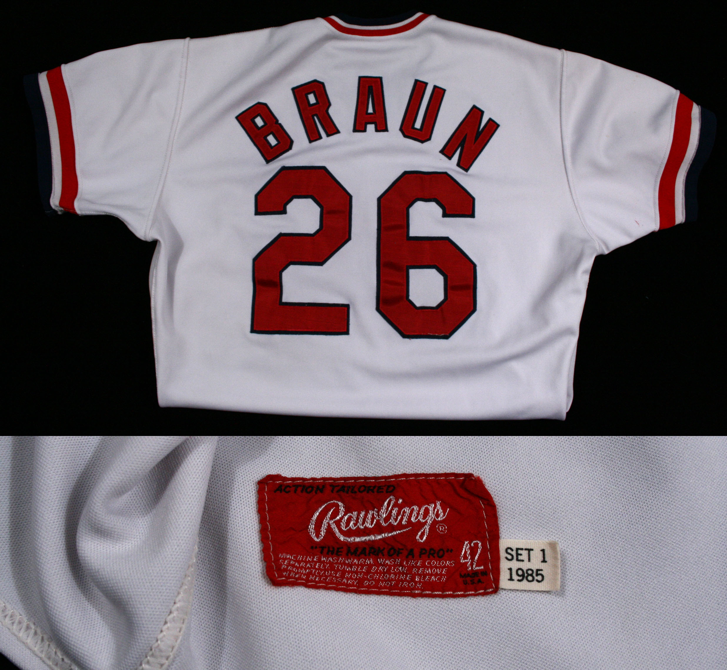 Description:1985 Steve Braun St. Louis Cardinals jersey. Home white knit pullover style jersey retains its original Cardinals embroidered logo on the front with the #26 beneath. "BRAUN" applied lettering and #26 appear on the back. A Rawlings size 42 tag and "SET 1 1985" flag tag remain affixed on the inside of the tail front. Jersey exhibits light usage and wash wear EX/MT