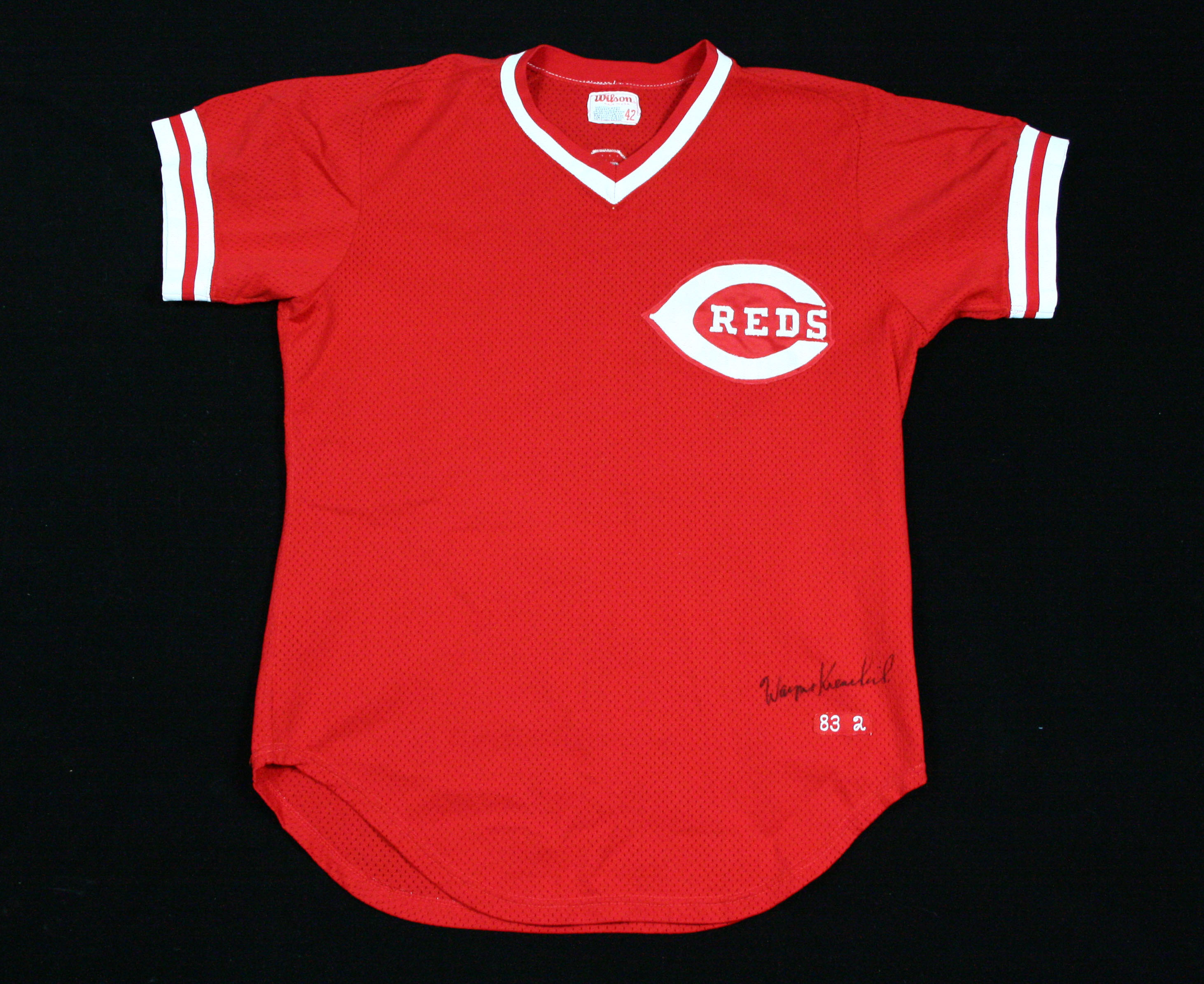 Description:1983 Wayne Krenchicki Cincinnati Reds jersey. Red mesh pullover style jersey retains its original Reds logo patch on the front. "KRENCHICKI" is across the back with the #15 beneath. Wilson size 42 tag remains on the inner collar and an "83 2" strip tag is on the lower left of the front. Krenchicki signed the jersey in black sharpie above the strip tag. Jersey shows light usage and wash wear: EX/MT