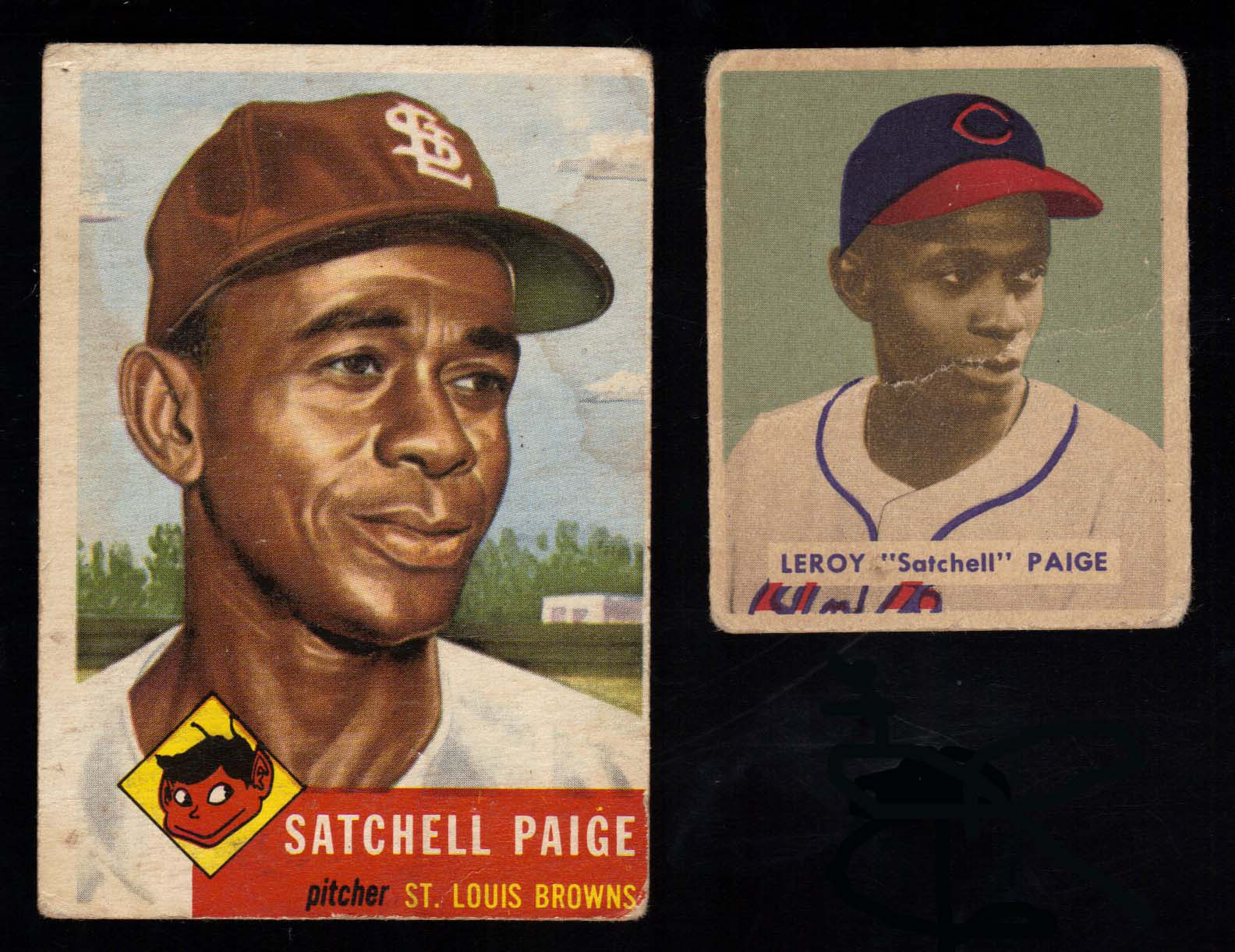 Description:1949 Bowman and 1953 Topps Satchell Paige cards. Incl. 1949 Bowman #224 rookie card (exhibits moderate rounding on all of the corners and a crease across the center (GD/VG) and a 1953 Topps #220 (exhibits moderate corner wear and has light moisture staining in some areas, GD).