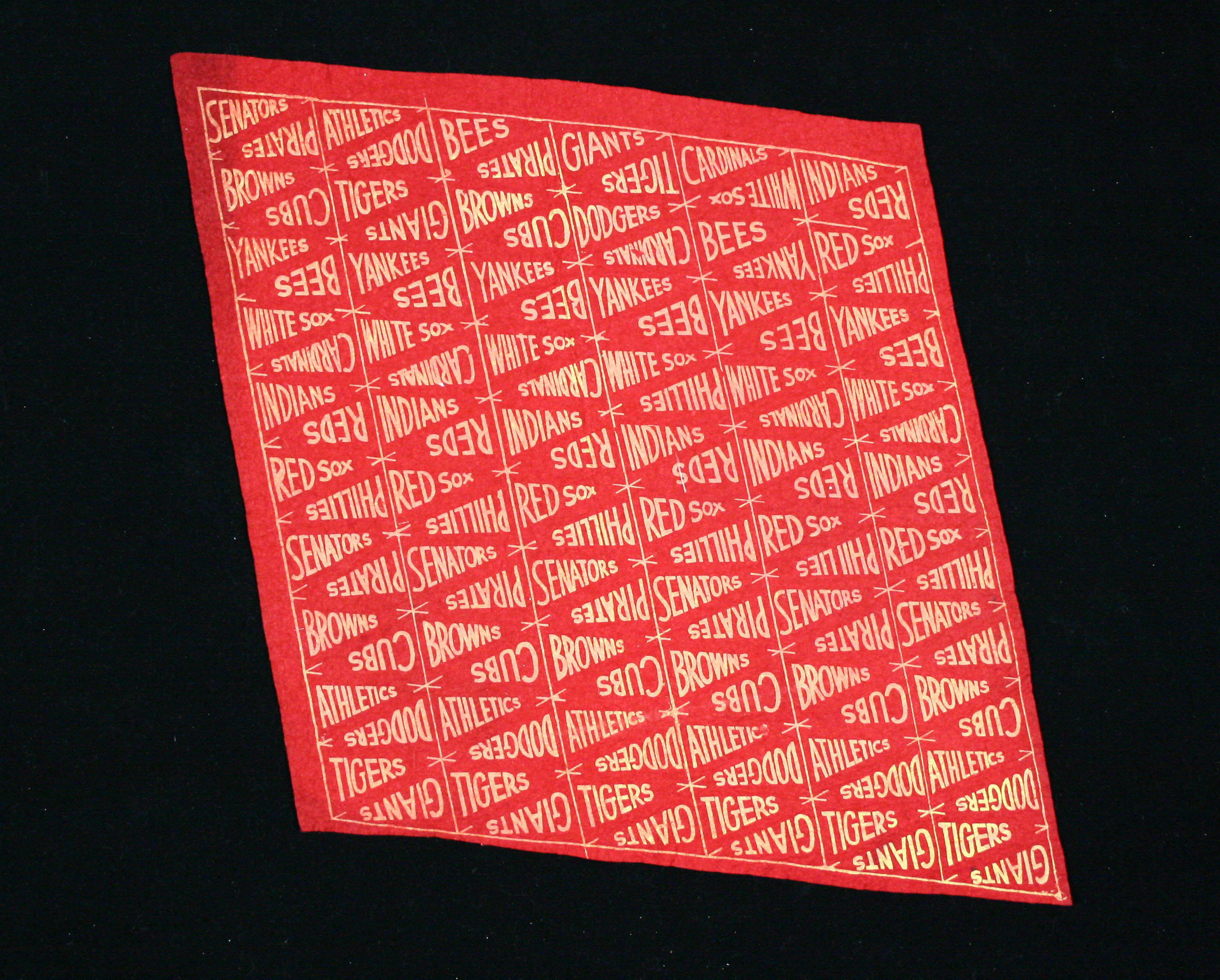 Description:Vintage baseball mini pennant uncut sheet c. 1936-40. Red felt sheet which is in a diamond sheet with the sides each measuring approx. 17" long. There are (120) mini team pennant on the sheet which each measure 2.5" in length. Every team from both the National and American Leagues is represented including the Boston Bees who were in existence from 1936-40. Sheet shows very minimal wear: EX/MT