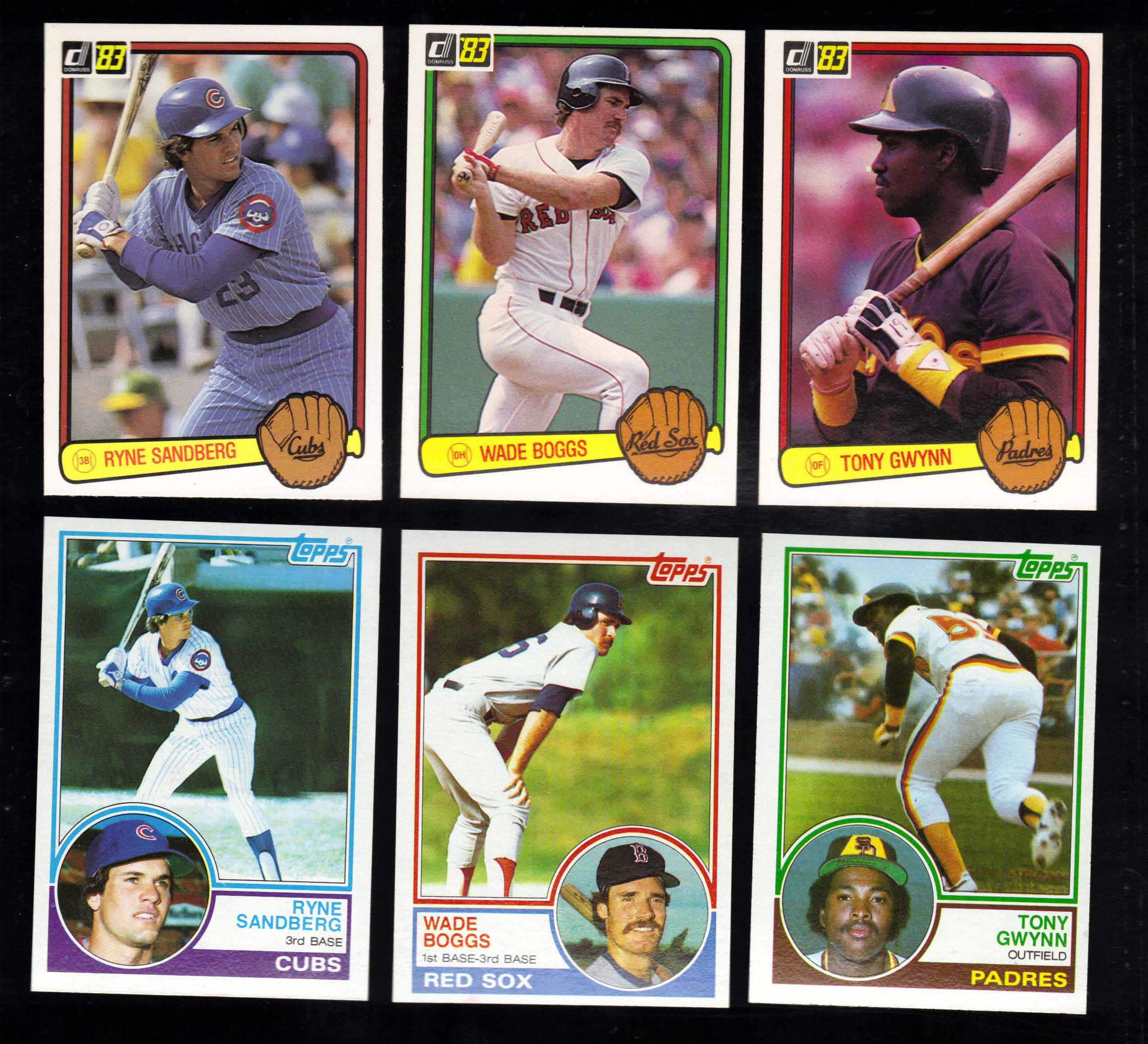 Lot of (21) 1983 Baseball rookie cards. Incl. (3) 1983 Topps #482 Gwynn, (3) 1983 Topps #498 Boggs, (3) 1983 Topps #83 Sandberg, (3) 1983 Fleer #360 Gwynn, (3) 1983 Fleer #179 Boggs, (3) 1983 Fleer #507 Sandberg, and (3) 1983 Donruss: #s 277 Sandberg, 586 Boggs, and 598 Gwynn: NM-MT
