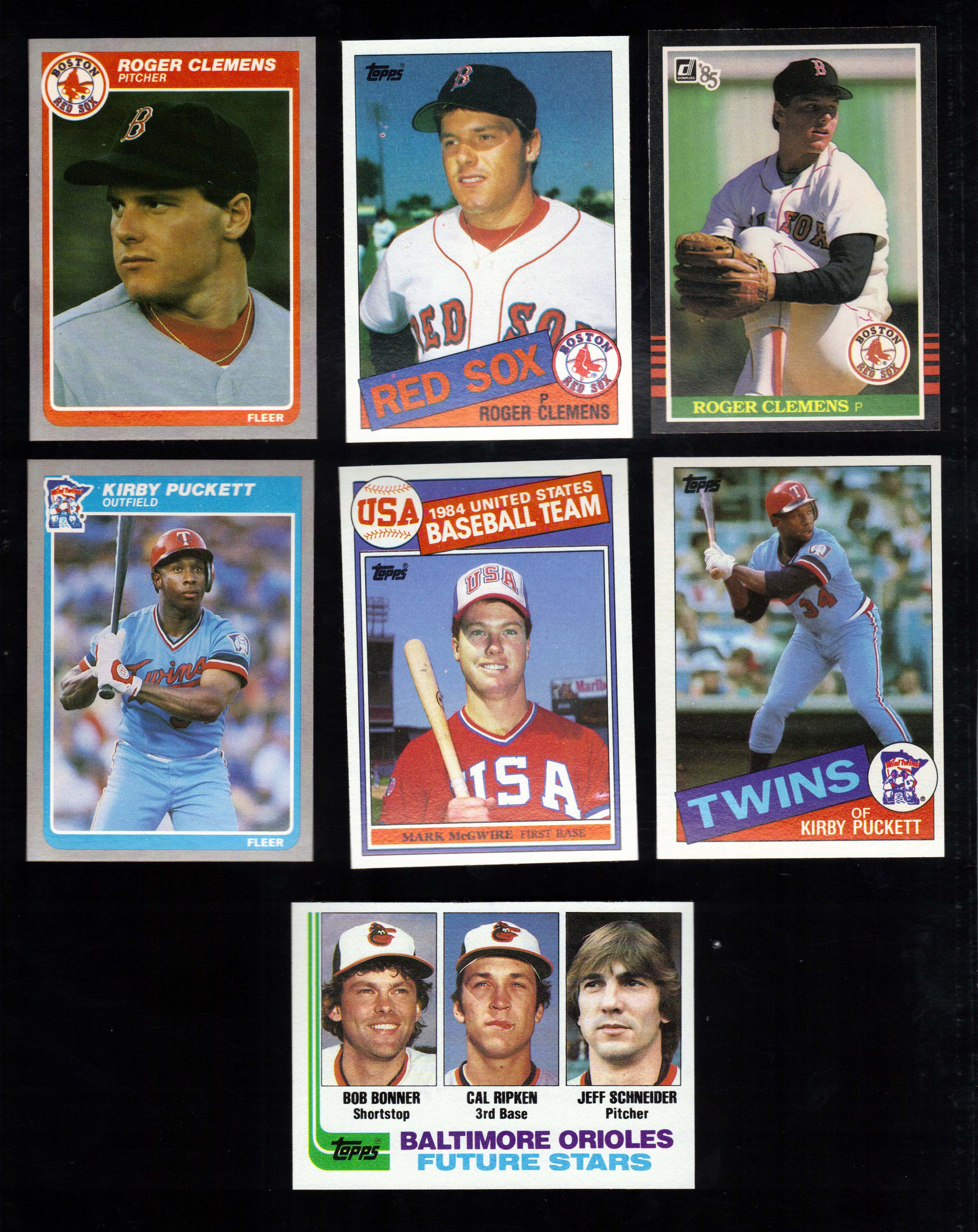 Lot of (14) 1980s Baseball rookie cards. Incl. 1982 Topps #21 Ripken, (2) 1985 Topps #401 McGwire, (2) 1985 Topps #181 Clemens, 1985 Topps #536 Puckett, (2) 1985 Fleer #155 Clemens, (2) 1985 Fleer #286 Puckett, (2) 1985 Donruss #273 Clemens, and (2) 1985 Donruss #438 Puckett: NM-MT