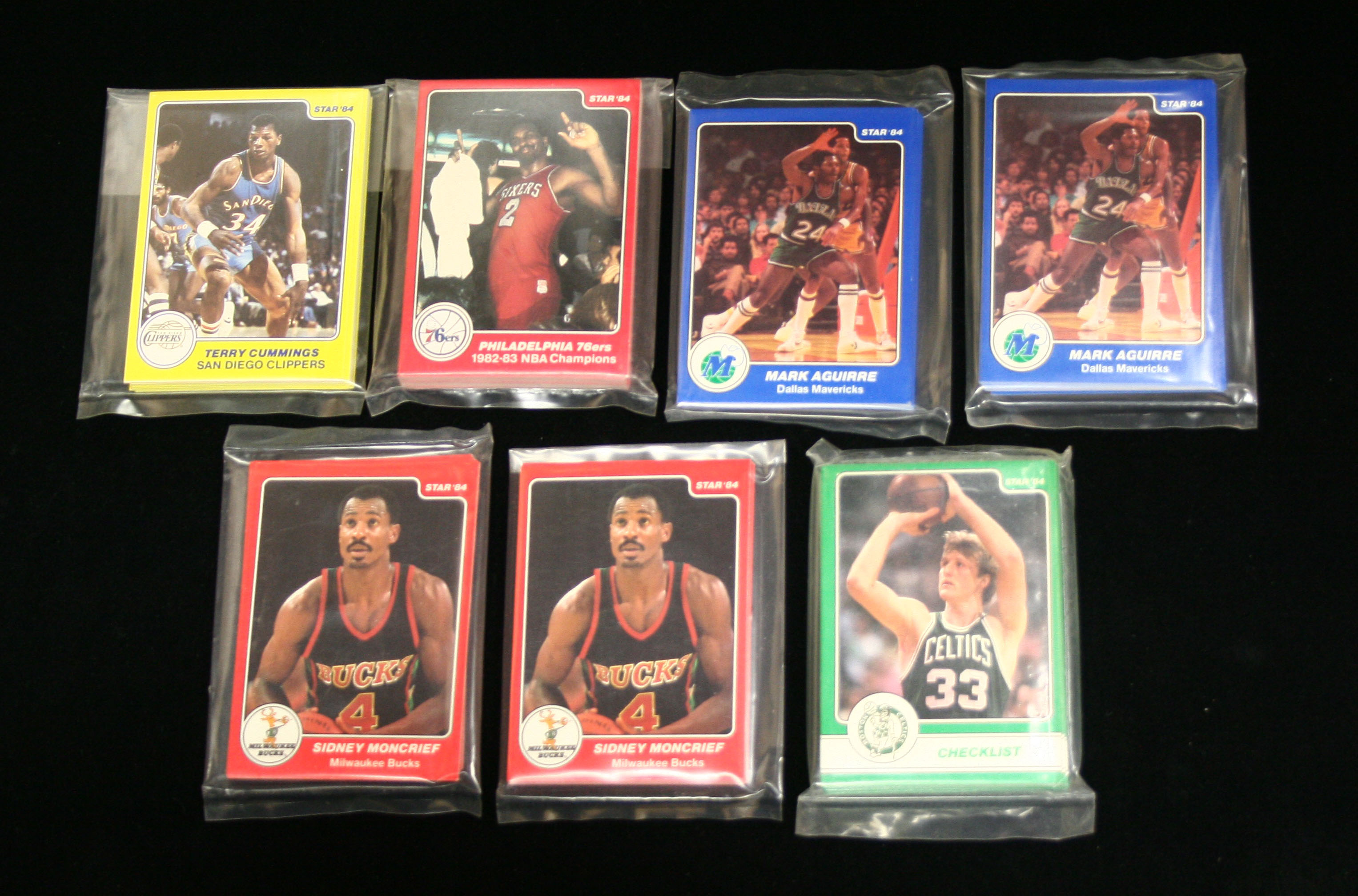 Description:Lot of 1983/84 Star basketball cards. Incl. (2) Dallas Mavericks factory sealed team sets, (2) Milwaukee Bucks factory sealed team sets, (1) Larry Bird (18)-card factory sealed set, (1) Philadelphia 76ers NBA Champions (25)-card set, and (1) rookie (10)-card set with Dominique Wilkins and James Worthy: NM-MT