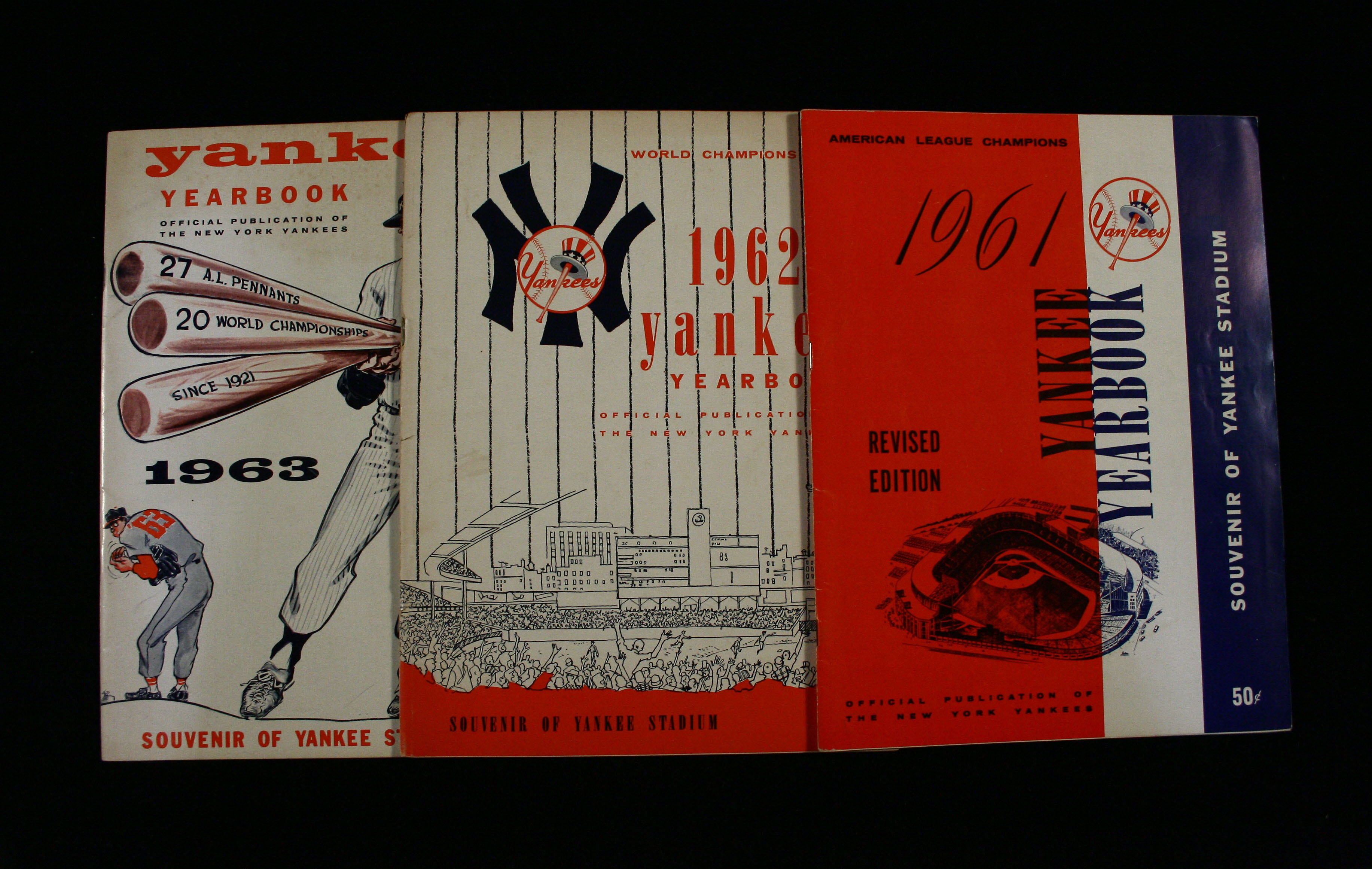 Description:1961-1963 New York Yankees yearbooks. Incl. a 1961 revised edition (EX with light corner and surface wear), 1962 (VG/EX with light age toning and spotting throughout), and 1963 (VG/EX-EX with age toning on the front and back covers).